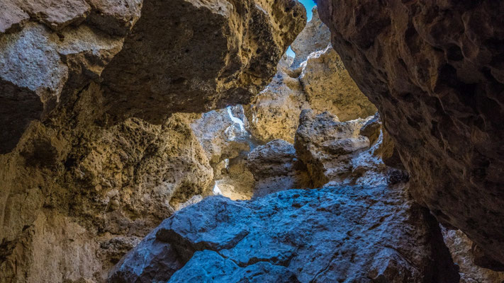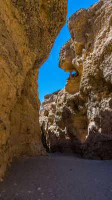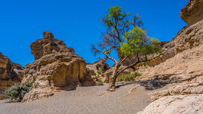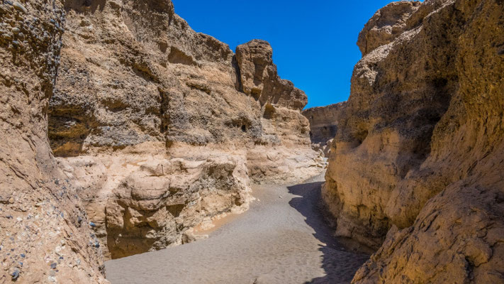 Wir machten uns als Erstes auf, um den Sesriem Canyon zu erkunden. Dieser liegt nur ein paar Kilometer von Sesriem entfernt. Die bis zu dreissig Meter tiefe aber schmale Schlucht, besucht man am besten in der Mittagszeit, dann, wenn die Beleuchtung aufgrund der hochstehenden Sonne am besten ist. Noch war eine ganze Busladung an Leuten in der Schlucht, aber bald lichteten sich die Besucher.