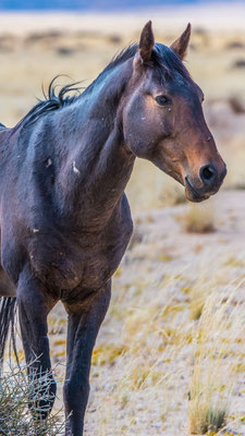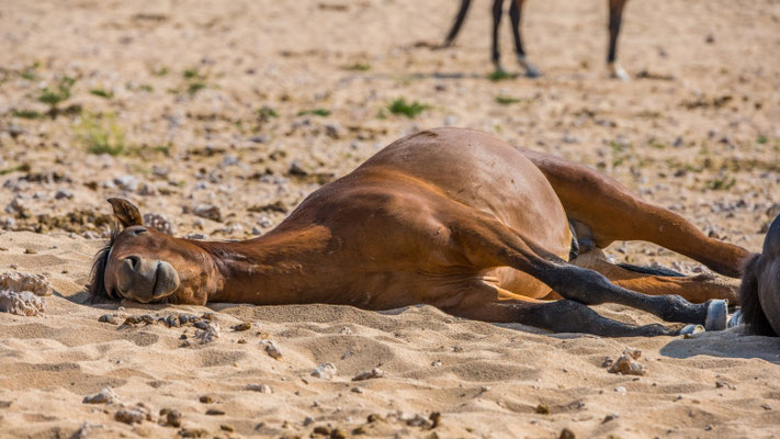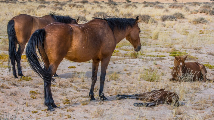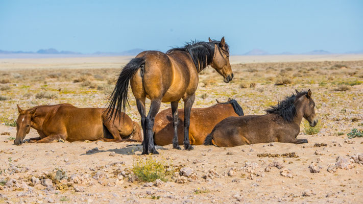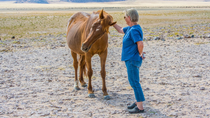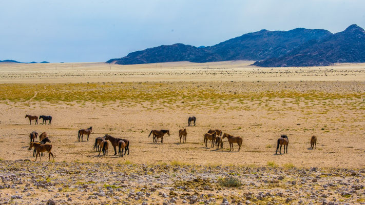 Unser Tagesziel heute war Lüderitz, etwa drei Fahrstunden entfernt. Von Aus aus, sind es noch 120 km bis zur Küste. Auf diesen gilt es 1500 Höhenmeter zu vernichten. Bereits nach 20 km lohnt sich der Zwischenhalt bei den Namid Pferden. In einer riesigen Ebene kann man mit Glück frei lebende Wildpferde beobachten. Kaum von der Hautstrasse abgebogen, entdeckten wir bereits eine Gruppe. Ueli schlich sich behutsam an und konnte Foto aus kurzer Distanz schliessen. Beim Beobachtungsstand hatte es aber gegen fünfzig Tiere, viele mit jungen Fohlen. Es stellte sich heraus, dass die Pferde sich zutraulich zeigten und keine Scheu vor Besuchern haben. Daher konnte man die herrlichen Tiere aus nächster Nähe beobachten.