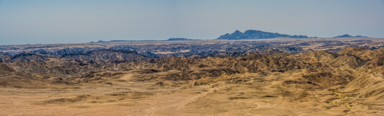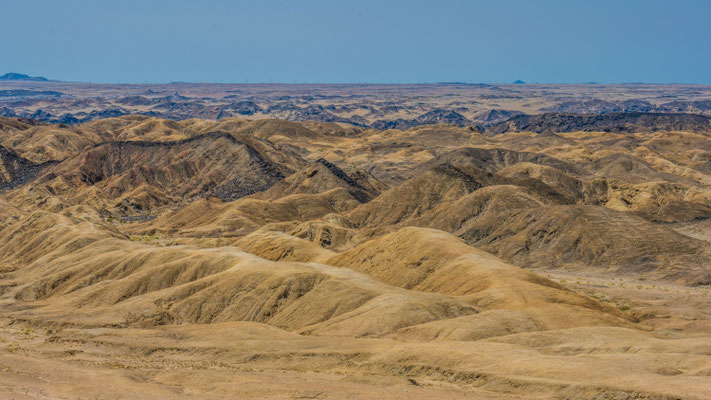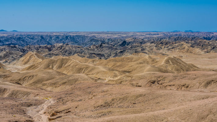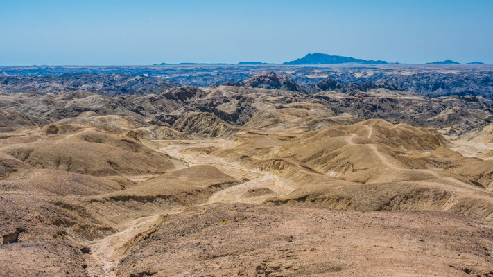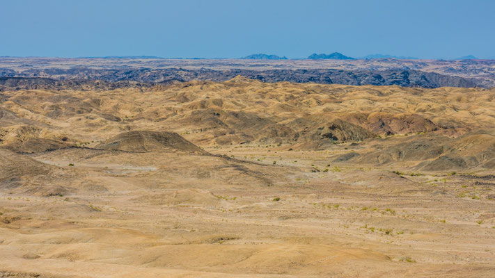 Wir waren daher gezwungen einen grösseren Umweg zu fahren um in die Gegend der Mondlandschaft und des Welwitschia Drives zu gelangen. Die Mondlandschaft ist eine Erosionslandschaft in mehrheitlich dunklen Farbtönen. Die Piste wurde dann zunehmend ruppiger und war geprägt von übelstem Wellblech. Welwitschias hatte es an einem Abstecher nach Norden über den Swakop hinaus, aber im Vergleich zu den bereits erlebten Pflanzen waren diese mickrig klein.
