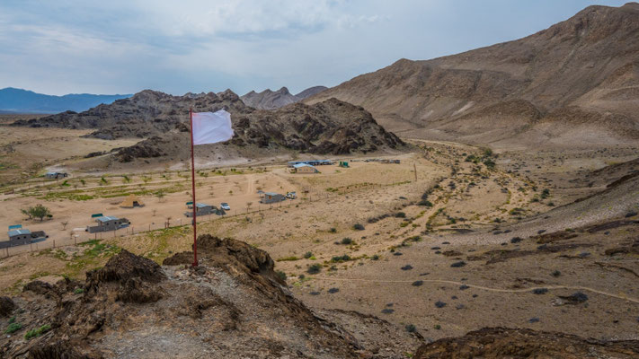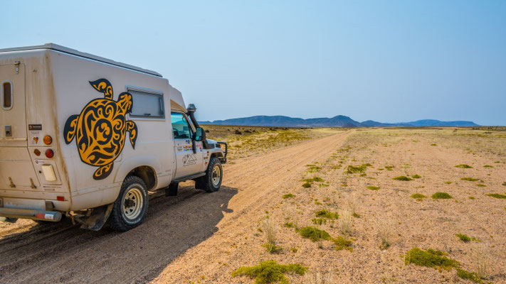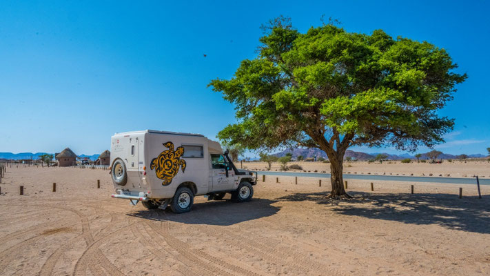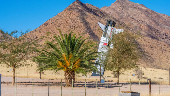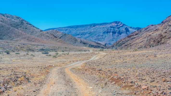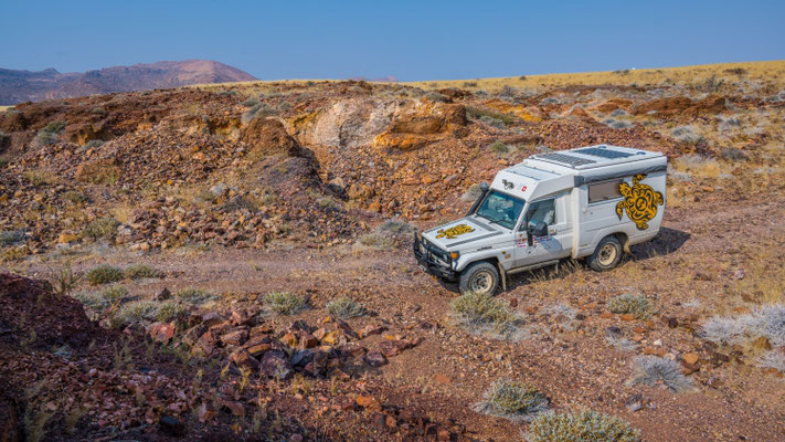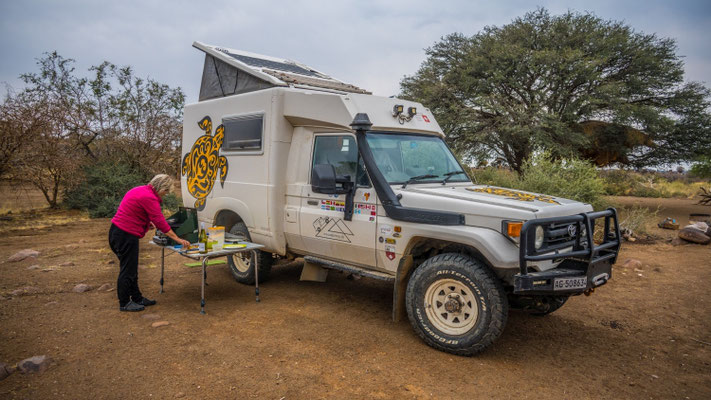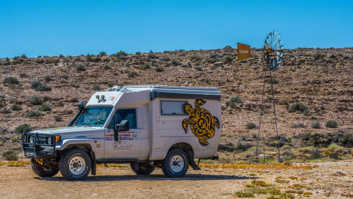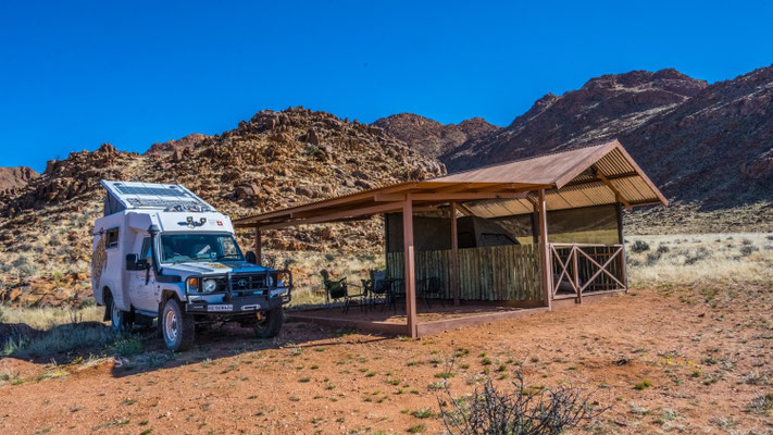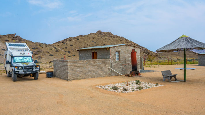 Nun galt es die 1500 Höhenmeter bis nach Aus hoch wieder zu überwinden. Dort tankten wir erst mal wieder etwas Diesel und fuhren auf einer guten Teerstrasse weiter südwärts. Bis nach Rosh Pinah waren es noch etwa zwei Stunden Fahrt und kurz danach richteten wir uns im Namuskluft Camping ein. Wir waren früh nachmittags bereits dort und konnten so den Nachmittag relaxen und warten bis der "Donkey" angeheizt wurde und wir nach einem feinen Apero eine warme Dusche geniessen konnten.