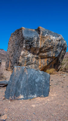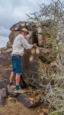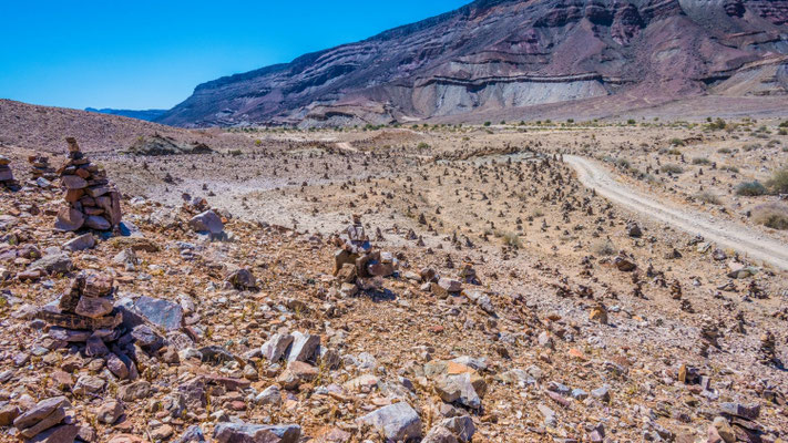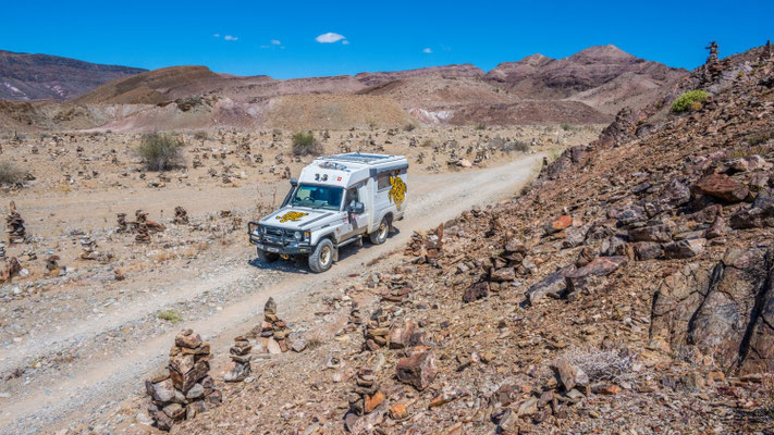 Über rumplige und wellblechige Pisten ging es erst in de Berge. Die Auffahrt zum Helskloof Pass war harmlos, aber die sehr steile Abfahrt auf der Nordseite war total ausgewaschen hatte tiefe ausgefahrene Löcher. Langsam runter im Geländegang war aber kein Problem und war sicher einfacher als in die andere Richtung. Die Piste blieb ruppig aber die Landschaft durch das schöne Tal entschädigte. Auf die riesige Ansammlung von „Steinmannli“ waren wir bereits aufmerksam gemacht worden. Hunderte davon haben durchfahrende links und rechts der Piste aufgebaut. Kurz vor unserem Etappenziel am Orange River sind in der Karte zwei Orte mit San Petroglyphen eingezeichnet. Leider haben sich zu viele „neuzeitliche Künstler“ hier verewigt und die eigentlich wertvollen Felszeichnungen sind kaum mehr zu erkennen.