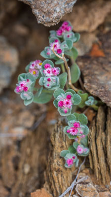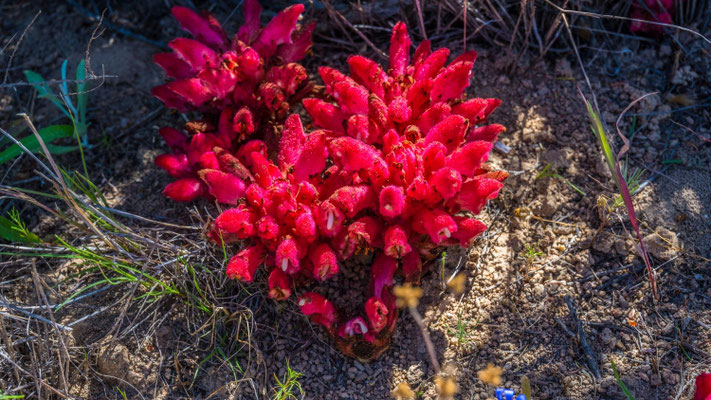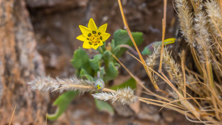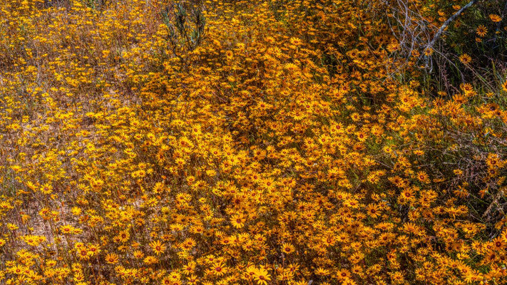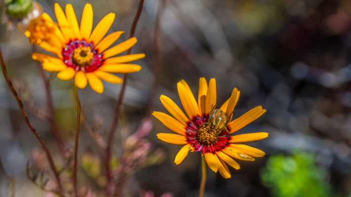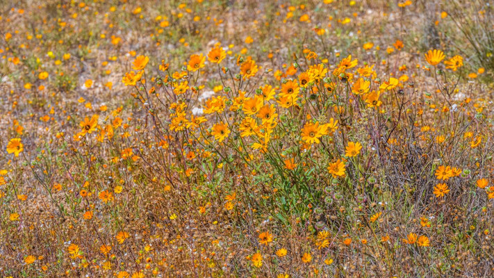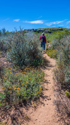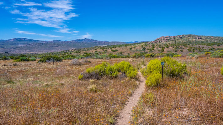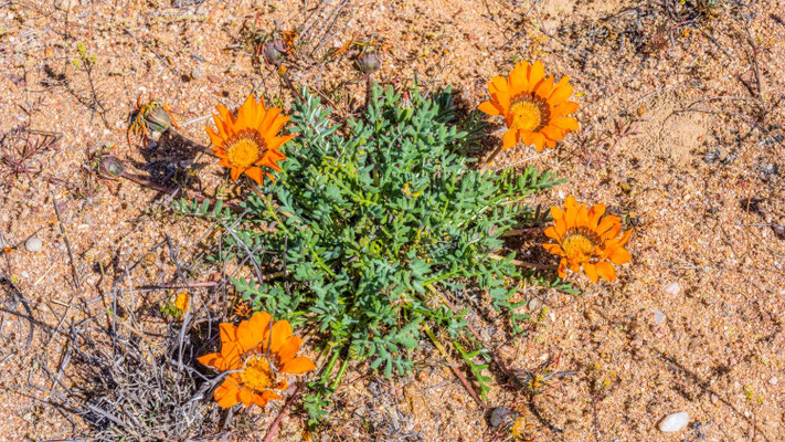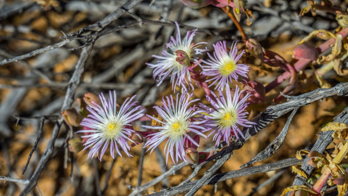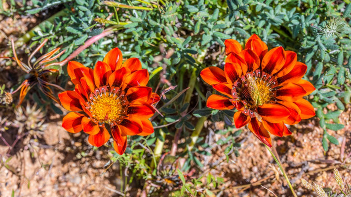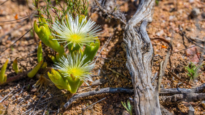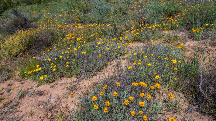 Unser Plan war, den Namaqua Nationalpark von Westen auf der ganzen Breite zu durchfahren. Die Strecke bis an die Berge war dann aber enttäuschend. Kaum blühende Blumen und landschaftlich eintönig zeigte sich der Park. Das blieb leider so bis zum Besucherzentrum im Osten. Die Landschaft wurde hinter Soebatsfontain interessanter, denn die Piste führte nun durch die Berge. Ein richtig steiler Pass brachte den Landcruiser zum Schwitzen. Im Besucherzentrum wurde uns dann bedauerlicherweise bestätigt, dass wir etwa vier Wochen zu spät dran waren, um den Höhepunkt der Blüte zu erleben. Wir machten aber eine kleine Wanderrunde durch die Umgebung und erfreuten uns an den wenigen verbleibenden Blumen. Wiederum begeisterte uns die Artenvielfalt. So mussten wir halt etwas genauer hinschauen und konnten uns nicht an gelben, roten und orangenfarbenen Blumenteppichen ergötzen.