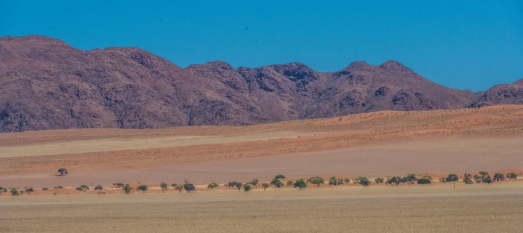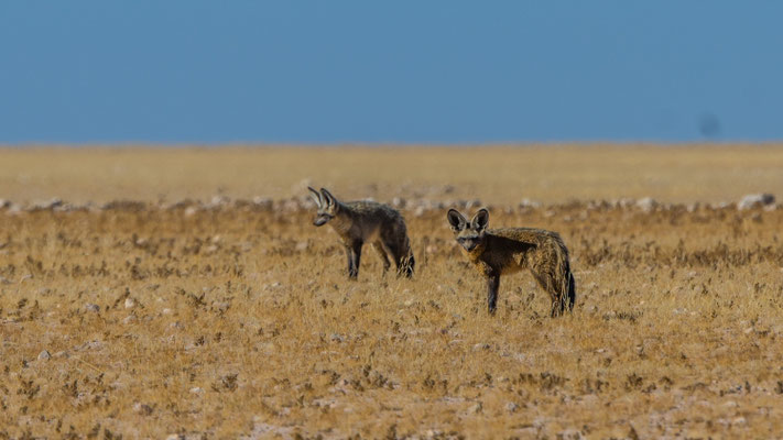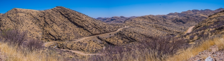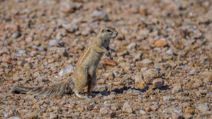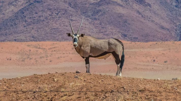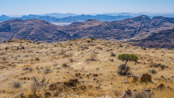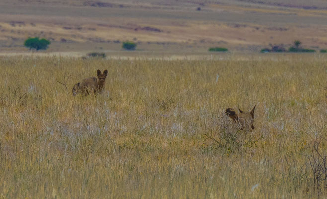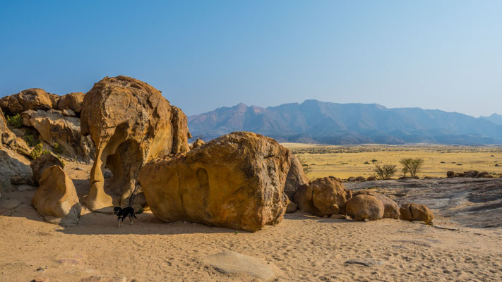 Noch vor dem Mittag machten wir uns wieder auf den Weg weiter südwärts. Auf der meist guten Piste kamen wir gut voran. Die Landschaft war nicht spektakulär, aber doch interessant und abwechslungsreich. Noch besser wurde es, als wir auf die D707 abbogen. Diese Strecke ist für die landschaftliche Schönheit bekannt und wir können dem nur zustimmen. Das die Piste erst kürzlich neu bearbeitet wurde, war die Fahrt auch sehr angenehm und sanft zu befahren. Die Farben und Formen der Berge wechselt laufend und immer wieder entdeckten wir einzeln Oryx Antilopen und einige Strausse. Wir hatten geplant, im Namtip Camping zu übernachten. Leider stellte sich heraus, dass der Platz bereits ausgebucht war. Deshalb mussten wir noch einmal fast eine Stunde fahren, kamen dann aber auf der Tiras Guest Farm unter. Und zwar bekamen wir das Rustic Mountain Camp, einer von nur drei Stellplätzen. Dieser liegt einsam gelegen, etwa 4,5 km von der Farm entfernt an einem Hang mit herrlicher Aussicht. Kein fliessendes Wasser, aber Warmwasser wie so oft durch ein Holzfeuer erhitzt und eine einfaches aber sauberes Plumpsklo wurde geboten. Da unser Wassertank aber angenehm warmes Wasser bot, nahmen wir lieber eine Freiluftdusche gleich neben dem Auto. Wir genossen die Ruhe und die Natur. Beim Wegfahren am Morgen eine Überraschung: Wir sahen Wildhunde recht nah beim Übernachtungsplatz. Diese Art kann man nur selten beobachten und auch wir sahen sie leiden nur kurz und aus der Distanz.