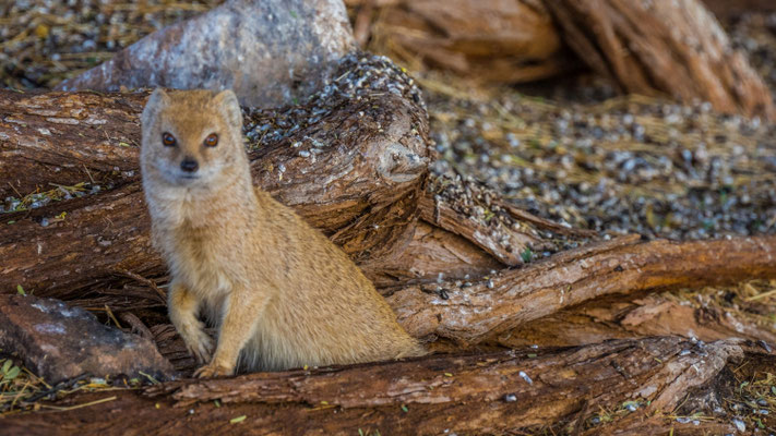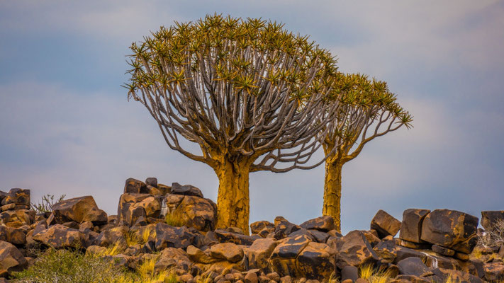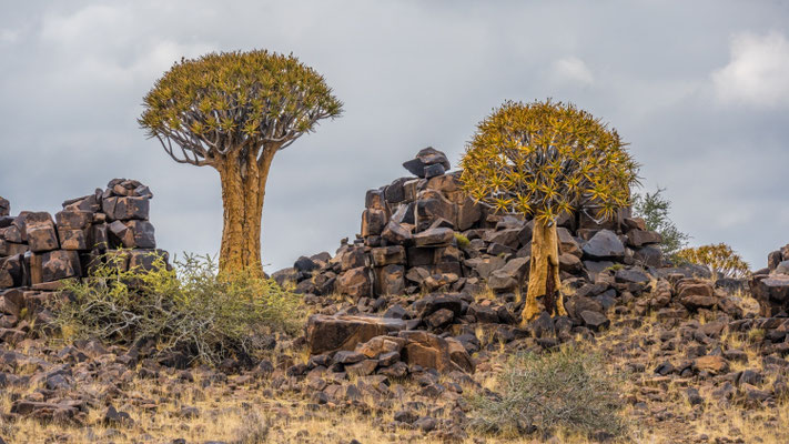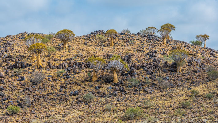 Am Morgen verzogen sich die Wolken bald einmal. Beim Frühstück bekamen wir noch Besuch von einer Fuchsmanguste (Yellow Mangoose). Der hübsche kleine Nager verursachte bei den Siedelwebern für Aufregung, auch wenn diese nicht auf seiner Speisekarte stehen. Wir machten einen Spaziergang in die Umgebung, um die herrlichen Köcherbäume im Sonnenlicht zu fotografieren. Unser Nachbar hatte seine Schlappen neben der Leiter zum Dachzelt abgestellt, diese aber morgens nicht mehr gefunden. Die Erklärung: Der heftige Regen hatte sie schlicht und einfach weggespült. Einen fanden wir etwa 50 m weiter unten, der zweite war wohl verloren.
