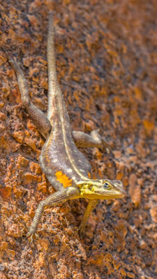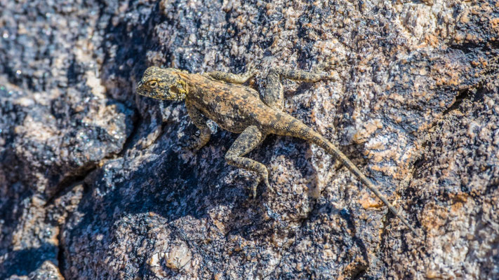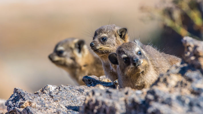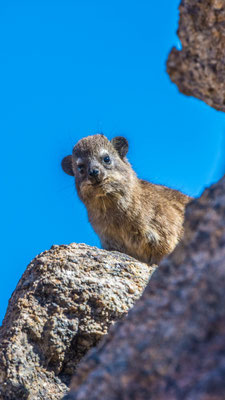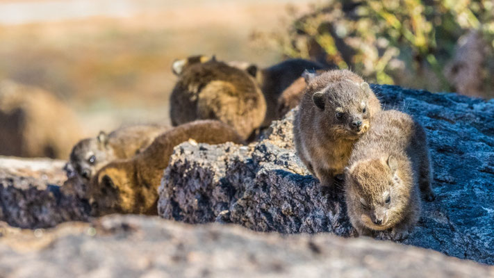 Die weitere Runde durch den Park liessen wir in Anbetracht der Situation aus und fuhren direkt weiter nach Springbock. Übernachten wollten wir aber nicht in der Stadt, sondern in der einige Kilometer ausserhalb gelegenen „Goegap Natural Reserve“. Der einfache Campingplatz bietet nur neun Stellplätze, doch wir waren die einzigen Gäste. Wir genossen die Umgebung, insbesondere die Klipschliefer Kolonie in den Felsen über uns. Erst verschwanden sie sofort in ihren Bauten, wenn wir uns auch nur in ihre bewegten. Ueli kletterte darauf etwas hoch und legte sich mit dem Fotoapparat auf die Lauer. Und tatsächlich dauerte es nicht lange und die putzigen Tiere hatten sich an ihn gewöhnt. So konnte er aus kurzer Distanz seine Bilder schiessen, auch wenn ein Wächter immer ein Auge auf ihm hatte.