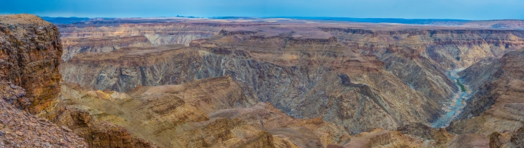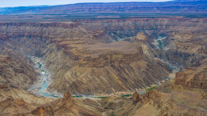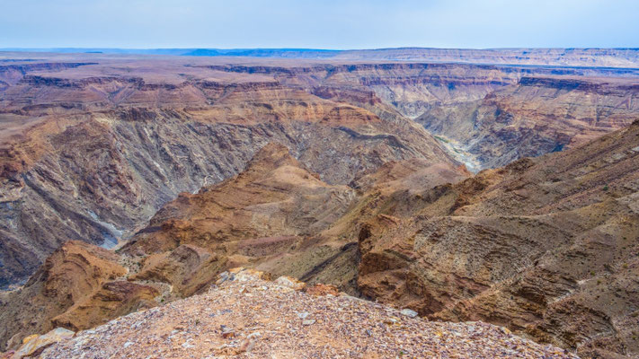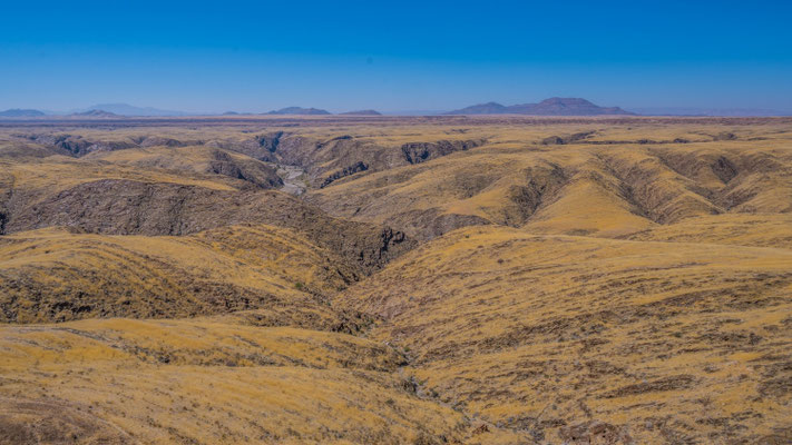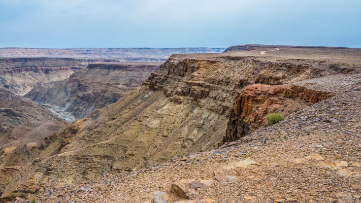 Je weiter wir nordwärts fuhren, desto mehr Wolken zogen durch den Himmel. Als wir beim Fish River Canyon ankamen, zeigte sich die Sonne nur immer kurz. So lag die eindrückliche Schlucht leider meist im Schatten, sodass die Farben weniger gut in Erscheinung traten. So oder so, der Besuch hatte sich gelohnt, auch wenn man ein paar Kilometer Wellblech Piste in Kauf nehmen musste. Zurück beim Eingang des Nationalparkes waren wir erstaunt überall Wasserpfützen zu sehen. Offensichtlich hatte es hier in der Zwischenzeit tüchtig geregnet. So gesehen hatten wir dann doch Glück bei unserem Besuch.