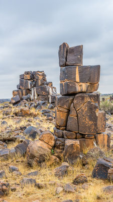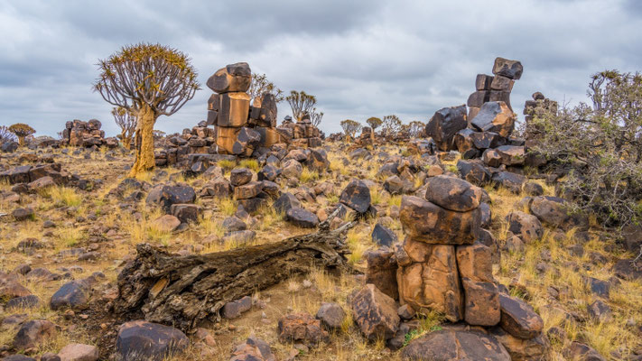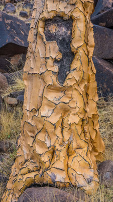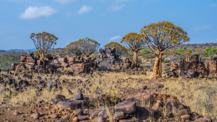 Wir packten unser Zeug und trafen uns mit dem Besitzer beim Office, um zusammen eine Tour zu den Fossilienfunden zu machen. 18 mm Niederschlag hat er gemessen, ein Segen für die Natur. Wir fuhren einige Kilometer auf sandigen Pisten, überall waren die bereits wieder abtrocknenden Wasserläufe zu sehen. Wir hielten bei einem Grab eines Deutschen Soldaten welcher 1904 hier von einheimischen Widerstandskämpfern erschossen worden war. Ganz in der Nähe wurde vor Jahren beim Strassenbau das erste Saurierfossil per Zufall entdeckt. Erst die Untersuchung durch namhafte Paläontologen zeigte sich, dass es sich um die ältesten Saurierfossilien Afrikas handelte. Beim Mesosaurus handelt es sich um eine kleine, Krokodil artige Echse von weniger als einem Meter Länge. Die Fossilien zeigen detailliert das Skelett der Tiere und es werden noch immer neue Funde entdeckt. Bei einem wunderschönen Köcherbaumbestand, umgeben von eindrücklichen Doloritformationen, endete die Führung, aber nicht bevor wir noch ein Konzert der Singing Rocks genossen hatten. Der Besitzer schlug dazu mit einem runden Stein auf die verschieden grossen Felsblöcke, welche entsprechend unterschiedliche, angenehme Töne erzeugten. Wir konnten uns aber selber noch etwas umsehen und fotografisch austoben. Immer neue Sujets waren zu entdecken.