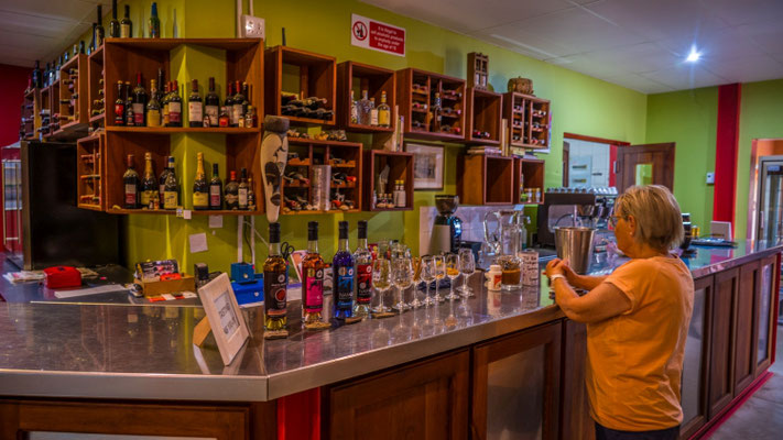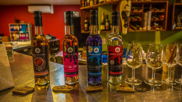 Auf dem Weg nach Keetmanshoop drohten immer wieder schwarze Wolken mit Regen, aber wir wurden weitgehend verschont. Am Naute Damm befindet sich eine spezielle Destillerie, welcher wir einen Besuch abstatteten. Sie destillieren aus Datteln der nahen, riesigen Plantage einen feinen Brandy welcher wiederum die Basis für zwei hervorragende Gins bilden. Wir degustierten die vier gebrannten Produkte und liessen uns die Prozesse und Zutaten erklären. Der eine der beiden Gins wird mit einer Violett färbenden Blüte aus Thailand verfeinert, was dem Getränkt eine vor allem eine exotische Farbe verleiht.