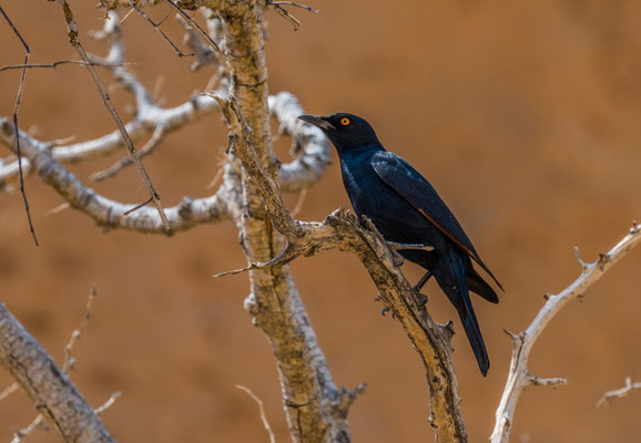 Zurück auf der Teerstrasse folgten wir dieser weiter nach Osten. Der Teer endete schliesslich und ging in eine gut befahrbare, breite Piste über. Nach etwa fünfzig km bogen wir zur Blutkoppe ab, wo wir einmal mehr ein schönes Camp vorfanden. Die Stellplätze sind minimal ausgestattet, aber dafür im Eintrittspreis inbegriffen. Auch hier sorgte ein gutes Dutzend schwarze, sehr zutrauliche Vögel für Unterhaltung. Im Gegensatz zum Vortag waren die Steaks diesmal wie sie sein sollten: Zart und saftig. Das Lamm am Tag zuvor war hingegen kein Gourmeterlebnis gewesen. Also besser Rind als Lamm? Wir werden berichten.