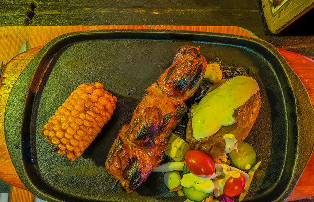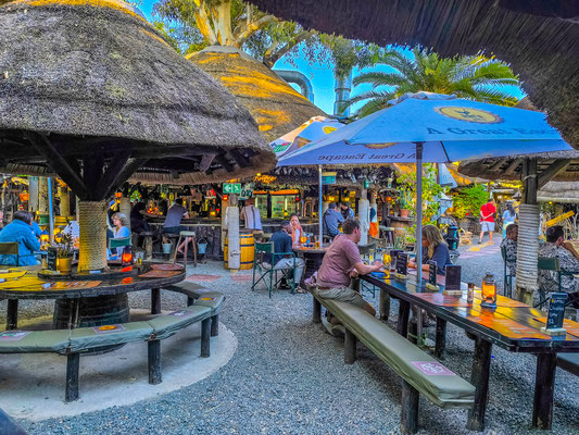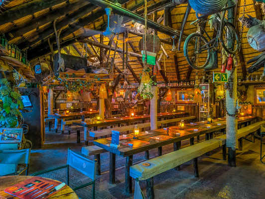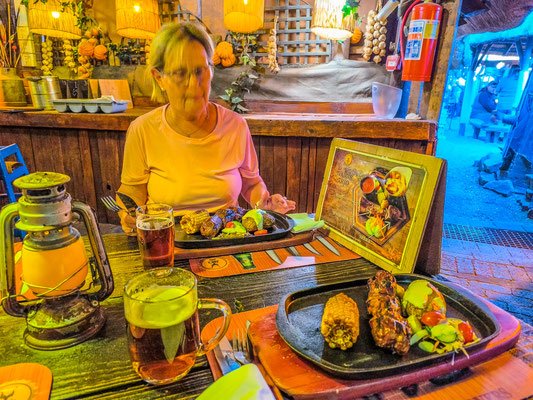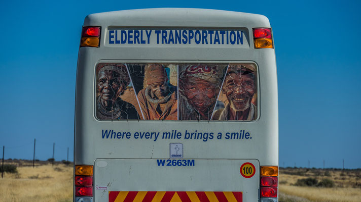 Auf dem Weg nach Windhoek gibt es nicht viel zu erleben. Die Strasse ist aber gut im Schuss und ausser in zwei kleinen Ortschaften muss man eigentlich kaum einmal vom Gas. Einen guten Lacher hatten wir, als uns ein altersschwacher Bus mit über 100 km/h überholte und wir den Slogan am Heck lasen (siehe Bild). Schon um die Mittagszeit herum erreichten wir unser Ziel. Wir richteten uns im Urban Camp ein. Dieser stadtnahe Camping hat für ausländisch zugelassene Fahrzeuge sogar einen günstigeren Tarif und bietet unter anderem auch einen Wäscheservice an. Diesen nutzten wir dann auch sogleich, nach drei Wochen reisen, hatte sich etwas Wäsche angesammelt. Am Abend gingen wir ins nahe Joe’s Bierhaus. Dieses Outdoorrestaurant hat Kultstatus und das mit gutem Recht. Ueli war schon vor dreissig Jahren mal da zu Nachtessen und hatte es immer noch gut in Erinnerung. Die Menükarte ist mehrheitlich fleischlastig und bekannt für seine Wildgrilladen. Wir bestellten dann auch das Namib Trio. Ein Fleischspiess mit Kudu, Zebra und Springbock Filet. Es war hervorragend und interessant die Geschmacksunterschiede der drei Fleischsorten zu schmecken.