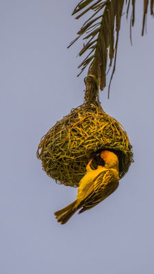 Danach fuhren wir nach Swakopmund und checkten im Camping Alte Brücke ein. Jeder Stellplatz hat sein eigens Bad- und WC-Häuschen, inkl. Abwaschbecken mit warmem Wasser. In den Palmen um uns herum waren die Maskenweber fleissig mit dem Nestbau beschäftigt. Unglaublich, wie schnell die Vögel vorankommen. Erst noch waren einige wenigen Grashalme in den Palmwedel verankert und schon bald sass der Vogel in einem stabilen Kranz, welcher die Basis für das kugelförmige Nest bildet.