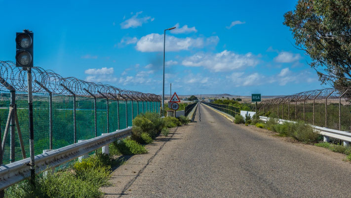 Die gute Teerstrasse verläuft bald dem Grenzfluss Orange River entlang. Immer wieder erhascht man einen Blick auf den Fluss. Er erscheint schon fast wie ein Störkörper in der an sich so trockenen Landschaft. Die ganze Region von Lüderitz bis zur Landesgrenze ist bis weit ins Innere Diamantenabbaugebiet. Logisch, dass die Minengesellschaften keine Besucher auf ihrem Gelände dulden. Nur die Hauptstrasse durch das Gebiet ist zugänglich, alle Pisten die von dieser abgehen sind gesperrt. Etwas mehr als eine Stunde benötigten wir um die Grenzstation zwischen Oranjemund und Alexander Bay zu erreichen.