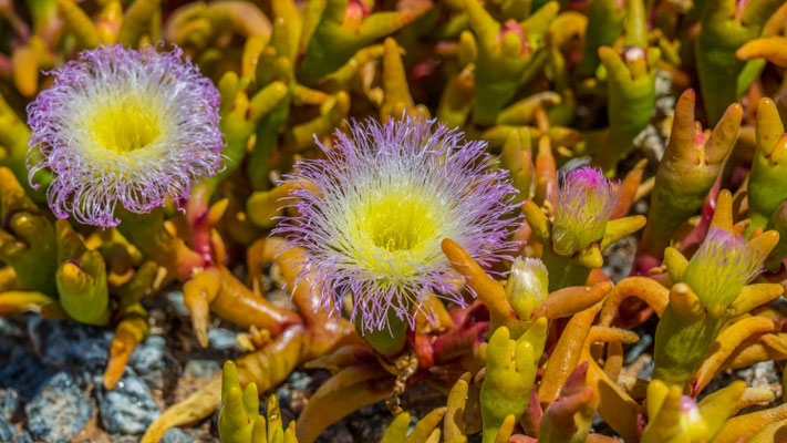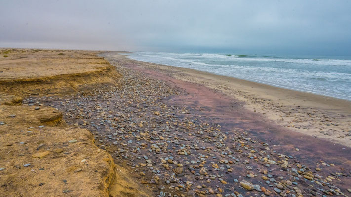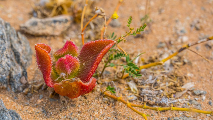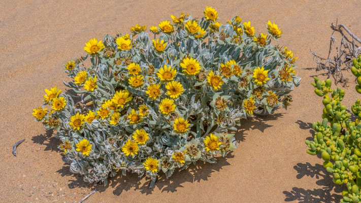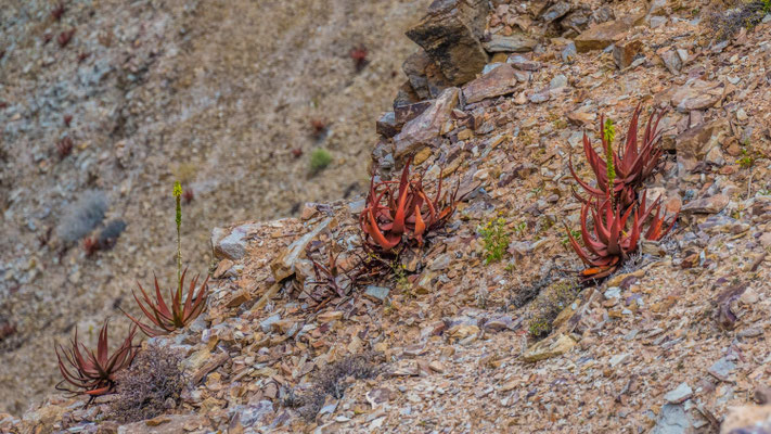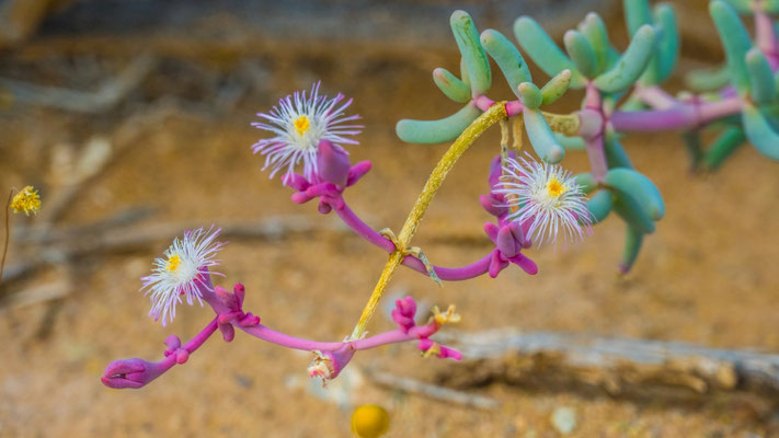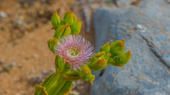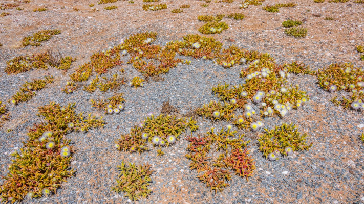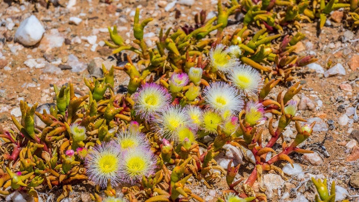 Da wir nicht sicher waren, ob am Sonntag die Grenzstation unser Carnet de Passage stempeln würde, blieben wir einen weiteren Tag, auch weil das Wetter direkt an der Küste noch windiger und sicher auch noch kühler war. Wir konnten so auch einige Dinge erledigen und hatten genug Zeit, um nachmittags einen Spaziergang durch die Umgebung zu unternehmen. Es ist immer wieder faszinierend, auch in diesem doch sehr wüstenähnlichen Klima, eine so grosse Biodiversität zu entdecken. Vor allem das nahe Trockenflussbett bot eine Vielzahl an Pflanzen. Büsche, Blumen aber vor allem aller Art Sukkulenten entdeckten wir.