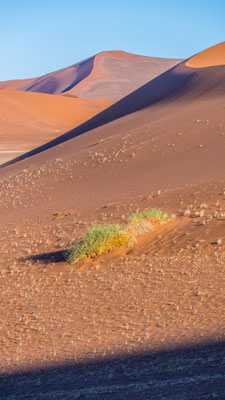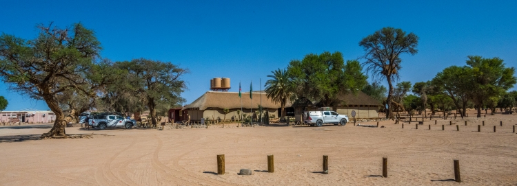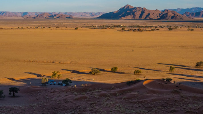 Wir erreichten Sesriem, das Tor zum Sossusvlei, schon vor Mittag in der Hoffnung, auch ohne Reservation einen Stellplatz zu ergattern. Im Camping ausserhalb des Parks war nichts zu machen, aber im offiziellen Camping des Nationalparks erhielten wir den letzten Platz zugeteilt. Auch wenn dieser Campingplatz nichts Spezielles zu bieten hat, sind die Preise gesalzen: rund 60 CHF für zwei Personen und Auto. Zwei grosse Vorteile hat es allerdings, wenn man bereits innerhalb übernachtet: Erstens gilt der Eintritt für 24 h, das heisst, man kann am Nachmittag bereits den Park erkunden, und hat den nächsten Tag ohne zusätzliche Kosten mit dabei. Zweitens schliesst das Tor zum Innern des Nationalparks für diese Gäste eine Stunde später und öffnet zudem eine Stunde früher am Morgen.