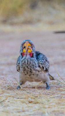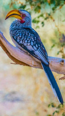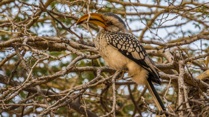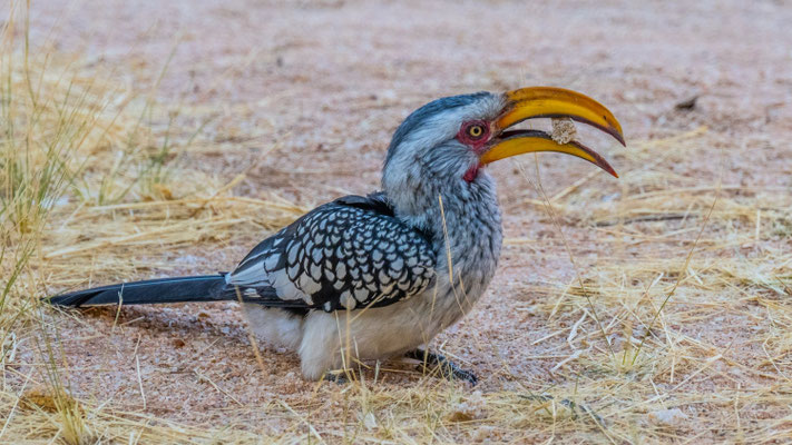 Vordergrund und dem blauen Himmel darüber. Beim Frühstück bekamen wir Besuch von drei recht zutraulichen und wunderschönen Rotringtokos. Die Vögel haben eine recht grossen, gekrümmten Schnabel