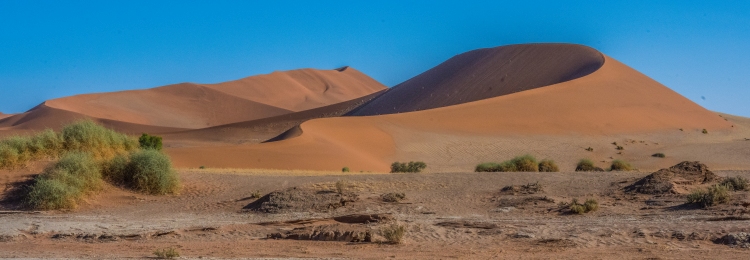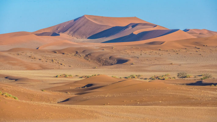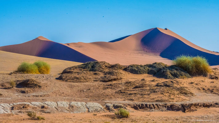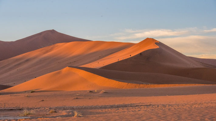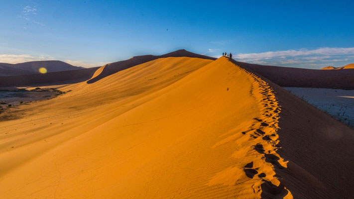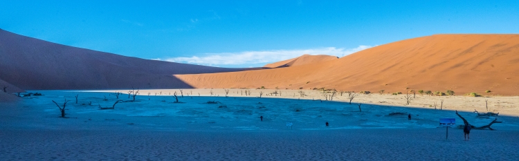 Wir fuhren dann auch, ohne anzuhalten auch die letzten 5 km über die weich sandige Piste zum Parkplatz. Wir starteten den halbstündigen Fussmarsch zum Deadvlei, nur um herauszufinden, dass sich dieser noch immer im Schatten einer hohen Düne befindet. Nach einer weiteren halben Stunde aber erreichte die Sonne die berühmte Ebene mit ihren abgestorbenen Bäumen vor dem fotogenen Hintergrund der roten Dünen. Noch waren nur wenige Leute anzutreffen. Aber als wir beim Parkplatz zurück waren, strömten immer mehr Besucher zum Ort der fotografischen Begierde.