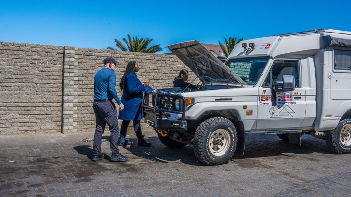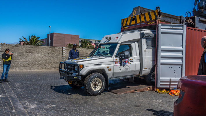 Ein Fahrer war von unserer Unterkunft organisiert worden und erwartete uns bereits. In einer viertel Stunde erreichten wir unser B&B. Nachdem wir die Agentur, welche unseren Container in Namibia betreute, kontaktiert hatten, wurde klar, dass es doch noch zu einer Verzögerung kommen würde. Das Problem war, dass das Schiff wohl pünktlich eingetroffen war, dann aber erst drei Tage später, an einem Freitag, die Ladung löschen konnte. Dann war Wochenende und der Zoll arbeitete nicht. Am Montag dann noch ein Strom- und dadurch ein Systemausfall, welcher noch einmal einen Tag kostete. Schliesslich wurde es schliesslich Donnerstag, bis wir gegen Mittag das Auto in Empfang nehmen konnten.
