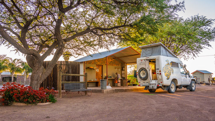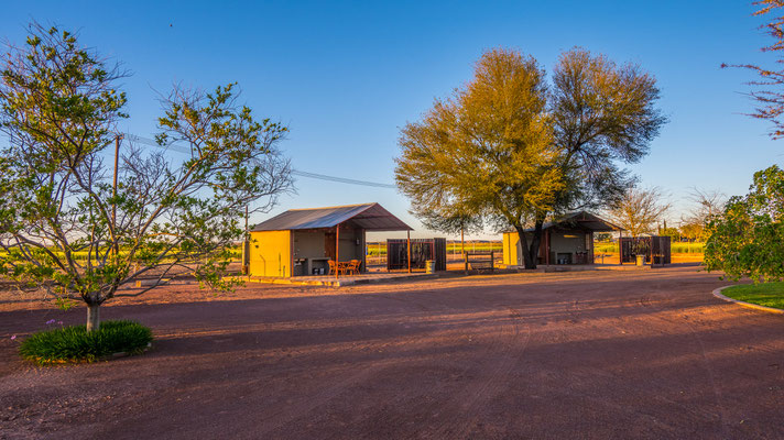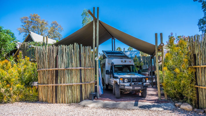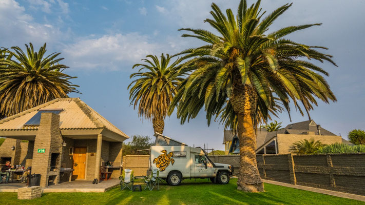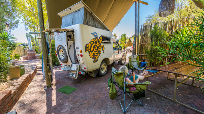 Nachdem wir in Keetmanshoop nochmal ein paar Besorgungen gemacht hatten, mussten wir bis Mariental noch gut 200 km „fressen“. Zu sehen gibt es auf dieser Strecke wenig. Die Landschaft ist flach und eintönig. Im Bastion Farmyard quartierten wir uns ein. Ein weiterer Campinghöhepunkt in Namibia. Nur vier Stellplätze aber jeder mit privatem Badehaus, Grill und einer schattigen Terrasse. Holz um den Donkey anzuheizen lag bereit. Wir genossen den Luxus bei angenehmen Temperaturen.
