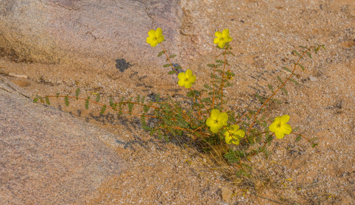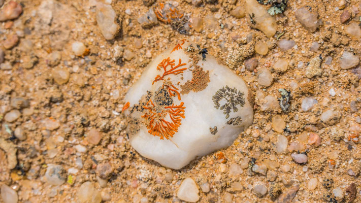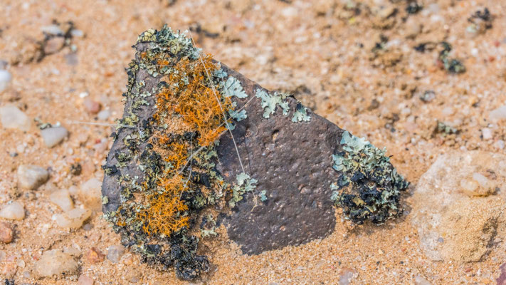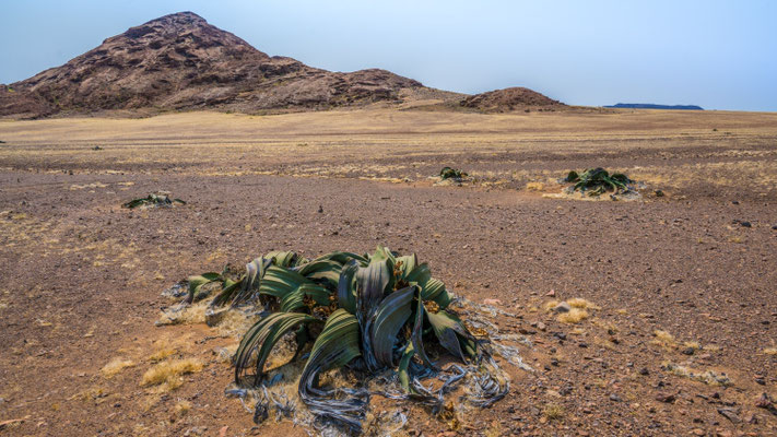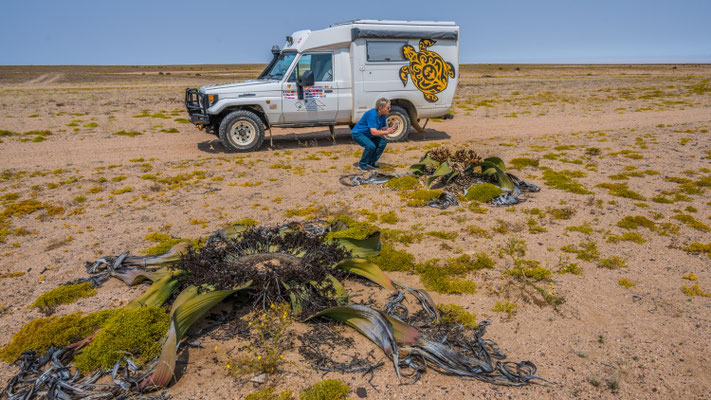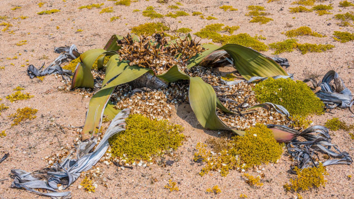 Vom Cape Cross bogen wir auf einer 4x4 Piste ins Landesinnere ab. Bald zeigte sich auch die Sonne und die Temperatur stieg zunehmend. Wenn man mal anhält, entdeckt man viele interessante Details am Boden. Seien es wunderschöne Flechten auch auf kleinen Steinen oder auch Blumen die blühen. Ganz besonders sind aber die Welwitschia Mirabilis. Die urzeitlichen Pflanzen werden sehr alt und bestehen eigentlich aus nur zwei Blättern. Diese teilen sich allerdings mehrfach und so sehen sie aus wir halbtote Agaven. Sie beziehen ihren Wasserbedarf über eine lange Pfahlwurzel und ein Netzwerk von oberflächennahen Wurzeln. Die Blüten sehen aus wie Tannzapfen, aber die einzelnen Blättchen werden durch Austrocknen sehr leicht und verteilen sich daher einfach mit dem Wind. Die Exemplare an der Strecke zum Messum Krater gehören zu den eindrücklichsten Namibias.