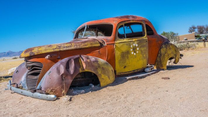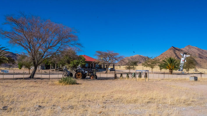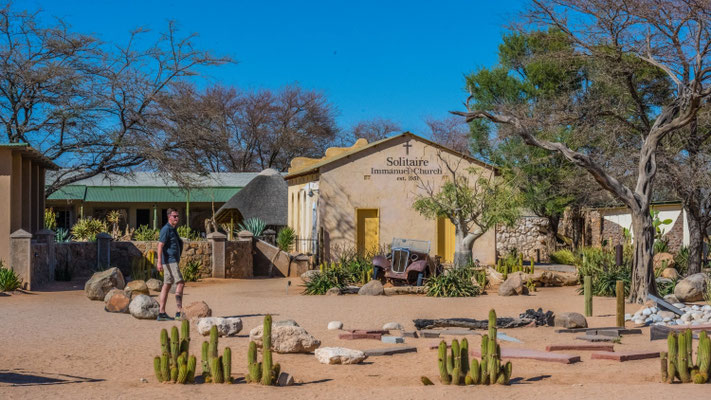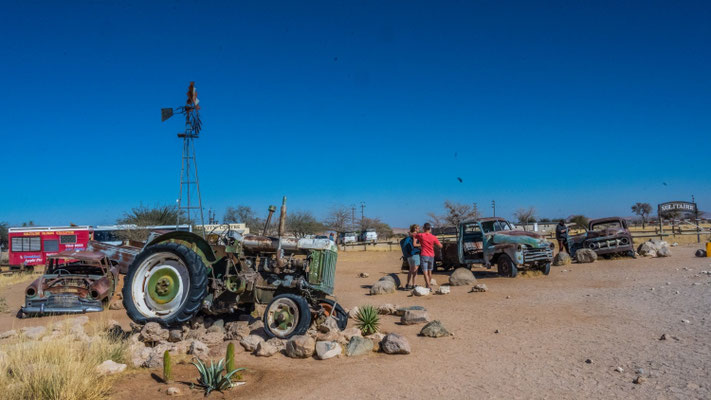 Nach kurzer Fahrt erreichten wir morgens Solitaire. Inmitten von nirgendwo hat sich ein unterdessen weltbekannter Ort eingerichtet. Ein Restaurant, ein Souvenirshop und eine Tankstelle bieten den Reisenden genug Grund, um einen Zwischenhalt einzulegen. So ging es dann auch zu und her wie in einem Bienenstock. Einzelreisende wie Tourbusse, alle machen sie hier Halt, wir natürlich auch. Überall stehen alte, verrostete Autos und Traktoren herum, beliebte Fotosujets.