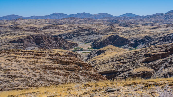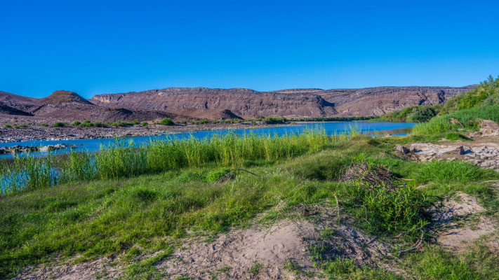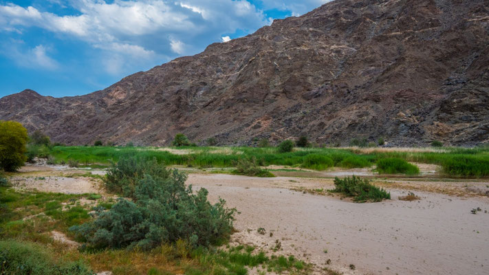 Es war eine warme Nacht, das Quecksilber fiel nicht unter zwanzig Grad. Am Morgen machten wir noch einen kurzen Spaziergang dem Fluss entlang. Klippschliefer Kolonien besiedeln die Felswände und grosse Schilfbestände an den wenigen Wasserlöchern erfreuen das Auge nach den vielen Sand und Stein Landschaften.