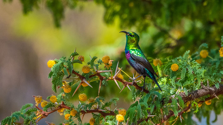 zeigten. Am eindrücklichsten und farbenfrohesten ist der Kolibri artige Glanznektarvogel. Im Sonnenlicht leuchtet sein vorwiegend grünes Federkleid und seine purpurrote