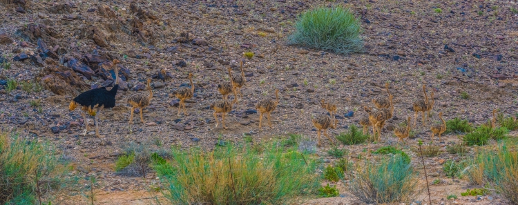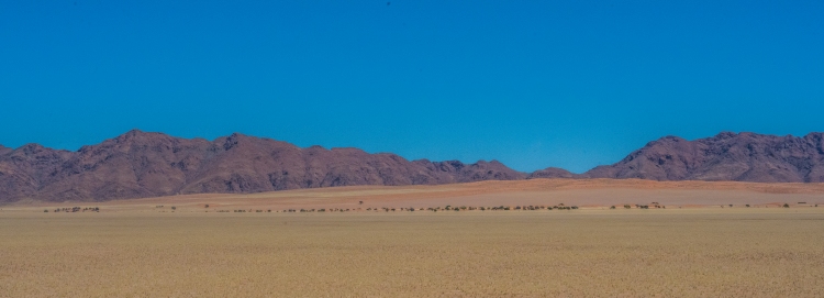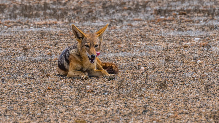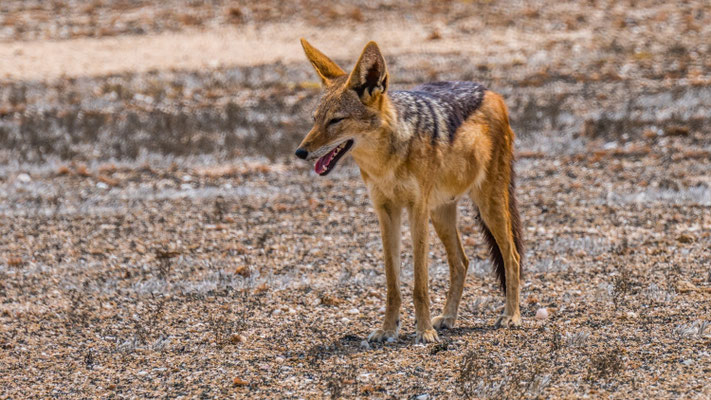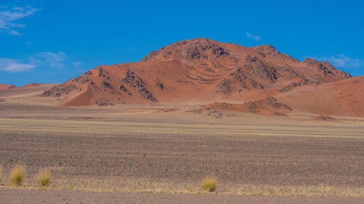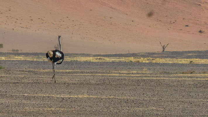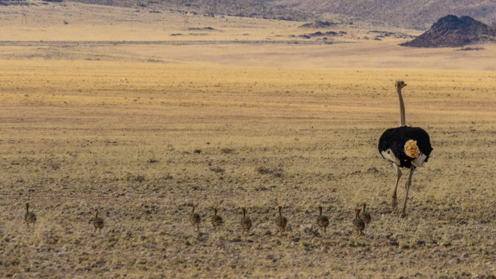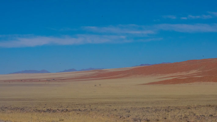 Von unserem Camp an der Blutkoppe führte eine Piste weiter ostwärts, vorbei an weitern, schönen Übernachtungsmöglichkeiten. In der weiten Ebene waren die Tiere einfach zu sichten. Immer wieder sahen wir Strausse aber auch einige Schabrackenschakale zeigten sich, wenn auch in einiger Distanz. Die trockenen Gräser erinnerten an wogende Weizenfelder, wenn bedeutend weniger dicht und hoch. Wir überquerten die Hauptpiste von Swakopmund kommend und tauchten gleich wieder in die Weiten des Nationalparks ein. Immer wieder tauchten isolierte klein Bergmassive auf, in allen Farben und Formen. Von der Hauptpiste Richtung Sesriem machten wir einen Abstecher zu einem Aussichtspunkt, von welchem man den Kuiseb Canyon überblicken kann. Eine sehr rumplige Piste führt an den Rand der Schlucht. Die Gegend wurde nun bergiger und die Piste glich einer Berg und Tal Fahrt. Da es sich um die Hauptverbindung zwischen Sesriem und Swakopmund handelt, hatte es entsprechend Verkehr. Wir aber bogen bald darauf in die Naukluft Berge ab. Die Landschaft wurde abwechslungsreicher und die gut befahrbare Piste wand sich schliesslich zum Gamsbergpass hoch, immerhin fast 2000 müM hoch. Aber dadurch erreichten wir nicht etwa einen Übergang, sondern eine Hochebene. Wir bogen kurz darauf nach Süden von der Hauptpiste ab. Über den Spreethootgepass ging es wieder spektakulär steil hinunter in die Ebene die wir vor einigen Stunden schon mal befahren hatten. Auf halbem Weg übernachteten wir im Spreethoogte Camping, mit herrlicher Aussicht nach Westen. Ein Angestellter kam hoch, um uns zu begrüssen und zu instruieren. Unter anderem startete er das Holzfeuer unter dem Boiler, sodass wir bald warmes Wasser für die wohlverdiente Dusche hatten. Im Unterstand genossen wir den Aperitif und später wurde der Grill einmal mehr angeworfen. Einen weiteren schönen Sonnenuntergang genossen wir ganz alleine an diesem herrlichen Ort.