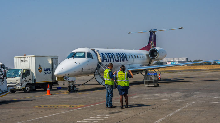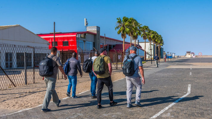 Der Flug von Basel via Istanbul nach Johannesburg war trotz des dreistündigen Aufenthaltes in Istanbul war, wie immer in der Economy Klasse, lang und mühsam. Der Service an Bord war einwandfrei, aber richtig schlafen konnten wir beide nicht. In Johannesburg hatten wir noch einmal drei Stunden Zwischenhalt, bevor es mit einer kleinen Maschine nach Walvis Bay weiterging. Mit an Bord war auch Peter, unser Containerpartner. Er war von Budapest kommend schon etwas früher eingetroffen. Der Flughafen in Walvis Bay ist winzig, aber der Vorteil ist, dass kaum Touristen diesen Flug nehmen. Es war deshalb eine Frage von einigen Minuten, bis wir die Einreiseformalitäten erledigt hatten. Und das, obschon wir das Visum erst vor Ort beschafften. Das Einreiseformular hatten wir als einzige Touristen bereits ausgefüllt mitgebracht und waren daher als erste an der Reihe.