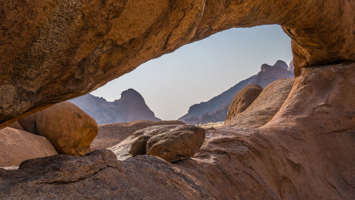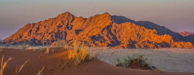 angestiegen, sodass wir den Gin Tonic zum Aperitif geniessen konnten. Bevor die Sonne unterging, leuchteten die umliegenden Felsen dunkelrot, daher der Name „Brandberg“.