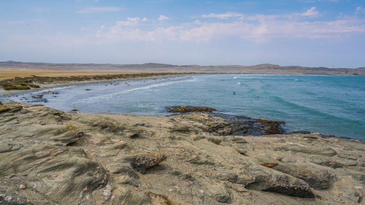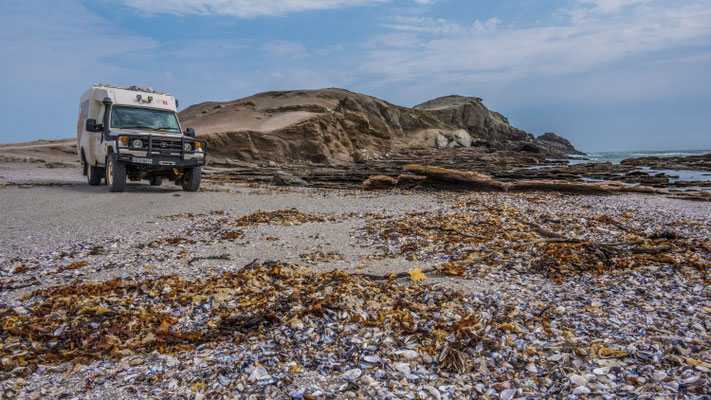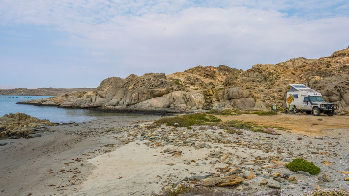 Erst aber fuhren wir noch nach Lüderitz hinein, um Brot zu kaufen und um uns etwas umzusehen. Viel Sehenswertes bietet das Städtchen allerdings nicht. Am berühmtesten ist wohl noch die Felsenkirche, von wo aus man auch eine schöne Aussicht auf die Stadt geniesst. Anschliessend fuhren wir zur Grossen Bucht und schliesslich zum Diaz Point. Dort erkundeten wir die schöne Küste, beobachteten in der Distanz eine Seelöwenkolonie und bewunderter die wunderschönen, gestreiften Felsformationen. Kurz nachdem wir uns am verabredeten Treffpunkt eingerichtet hatten, trafen auch unsere neuen Bekanntschaften ein. Wir luden die Beiden zum Spaghetti Essen ein und Rowan buk auf dem Feuer ein feines Brot. Wir erlebten einen unterhaltsamen Abend zusammen und zogen uns schliesslich erst ins Auto zurück, als es ungemütlich kalt wurde.