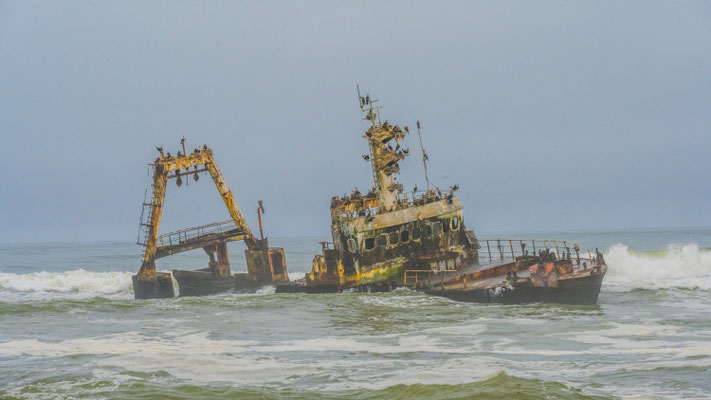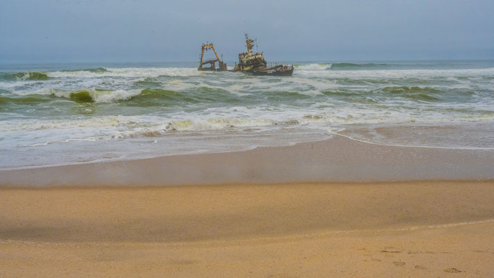 die Ausnahme, folgten wir der Skelettküste nordwärts. Eines der vielen Schiffswracks ist noch immer weitgehend intakt und eine gut besetzte Kormoran Kolonie.