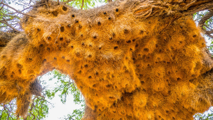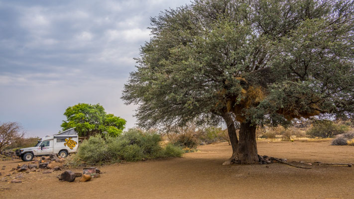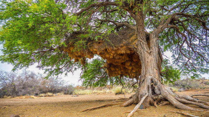 In Keetmanshoop wollten wir noch Brot kaufen, aber ausser industriellem Schaumgummibrot war nichts im Angebot. Also, dann backen wir doch lieber selber. Wir fuhren noch 40 km weiter nach Osten, um im Mesosaurus Fossil Camp unterzukommen. Der Besitzer hat auf seinem Land etwa drei Kilometer von der Hauptpiste entfernt ein einfaches Bushcamp eingerichtet. Wir suchten uns einen windgeschützten Platz. Unsere Nachbarn waren hunderte kleiner Siedelweber, welche unglaublich grosse Gemeinschaftsnester bauen. Diese können gut und gerne einige Meter gross sein und sie werden von bis zu hundert Vögeln bewohnt. Ihre individuellen Eingänge sind unter und daher von keinem Fressfeind zugänglich. Die kleinen Vögel waren überaus zutraulich und wir mussten manchmal aufpassen nicht auf sie zu treten.