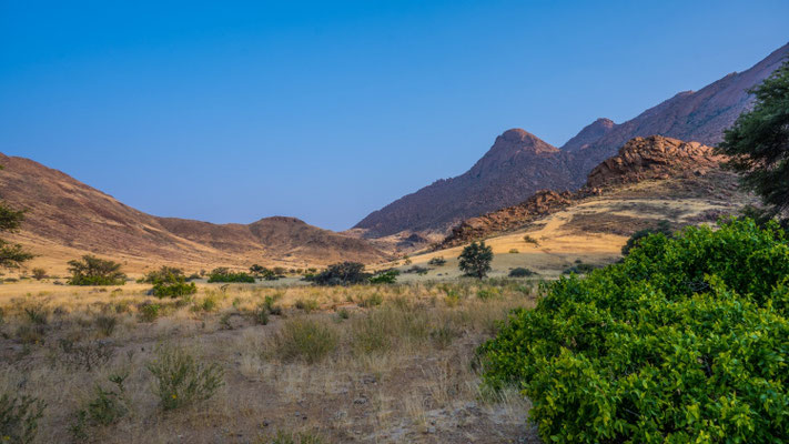 In der Aminis Schlucht, auf der Südseite des Brandberg Massivs, fanden wir ein herrliches Buschcamp. Die Temperatur war unterdessen auf über dreissig Grad