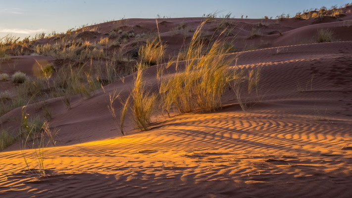 Dass es sich auszahlt, eine Stunde mehr zur Verfügung zu haben, erfuhren wir bald schon selber. Wir konnten nämlich den Sonnenuntergang auf der ersten grossen Düne ohne Stress geniessen, während die ausserhalb Wohnenden bereit eine Viertelstunde davor wieder draussen sein mussten. Den Platz mit Aussicht muss man sich aber hart erarbeiten. 1,5 km und 180 Höhenmeter im weichen Sand gilt es zu bewältigen, bevor man den höchsten Punkt der Düne erreicht. Der Sonnenuntergang war dann allerdings aufgrund des einheitlich blauen Himmels eher enttäuschend, aber die Aussicht lohnte die Anstrengung.