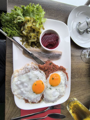 wahrlich spezielle Kombination, ein Brei aus Pökelfleisch, Zwiebeln, Rote Beete und Kartoffeln. Dazu serviert man Essiggurken, Spiegeleier, Rote Beete und Matjes (eingelegter Hering). Myrtas