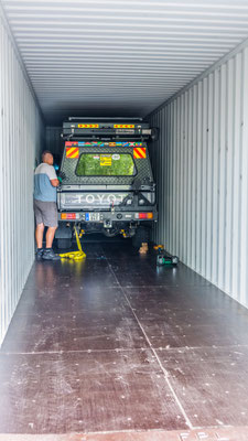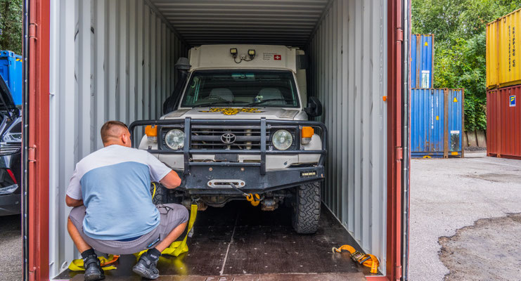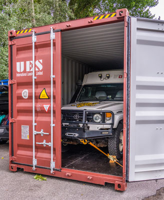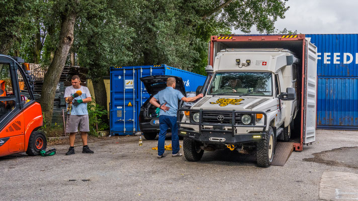 Im Frühling begannen wir Offerten für die Verschiffung einzuholen und entschieden uns den Transport mit Overlander Shipping in Hamburg zu machen. Unser Auto passt in einen Hicube Container und wir bevorzugen diese Art Verschiffung vor der RoRo Verschiffung, einfach weil das Risiko eines Einbruchs oder der Fahrzeugbeschädigung beim Transport deutlich geringer ist. Dem gegenüber stehen allerdings etwas höhere Kosten und oft längere Transitzeiten. Aber wenn man einen 40’-Container mit einem anderen Overlander teilen kann, lassen sich wiederum Kosten pro Fahrzeug einsparen. Schlussendlich beliefen sich die Verschiffungskosten inkl. Versicherung und allen Gebühren am Abgangshafen Hamburg auf 3000 CHF pro Fahrzeug. In Walvis Bay (Namibia) kommen dann noch einmal 700 CHF an Hafengebühren und Agentenhonorar dazu (Stand 2025).