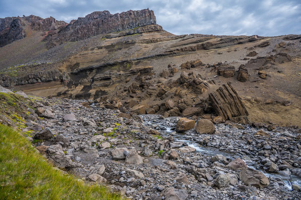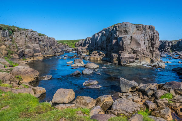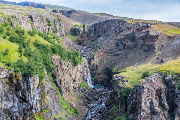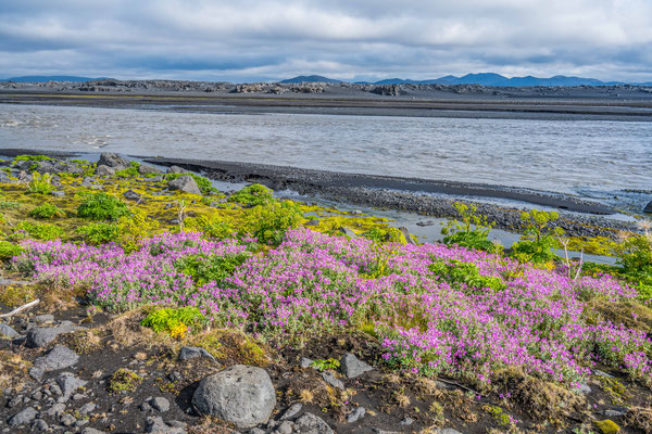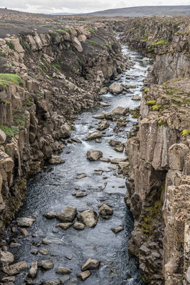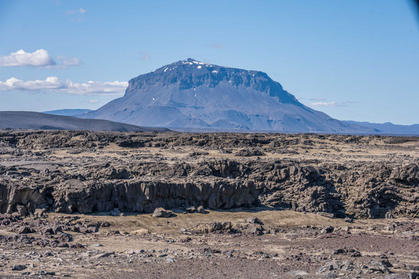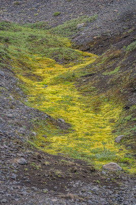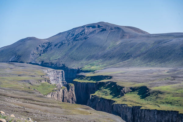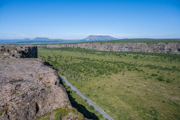 Bald darauf erreichten wir den Jökulsargljufur Nationalpark, wo wir uns im hübsch angelegten Campingplatz einrichteten. Da es noch früher Nachmittag war, blieb uns genügend Zeit für die kurze Wanderung auf die nahen Klippen. Wie ein Schiffsrumpf ragt eine Felszunge zwischen zwei Tälern aus der Ebene auf. Die Oberfläche des Plateaus weist eine interessante Flora auf, wobei man sich oft wundert, wie es den Pflanzen überhaupt gelingt auf dem kargen Boden zu gedeihen. An der südlichen Spitze angelangt, hat man einen herrlichen Ausblick auf den hufeisenförmigen Talkessel mit seinen senkrechten Lavaklippen.