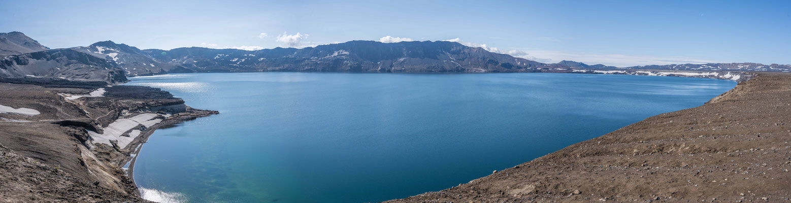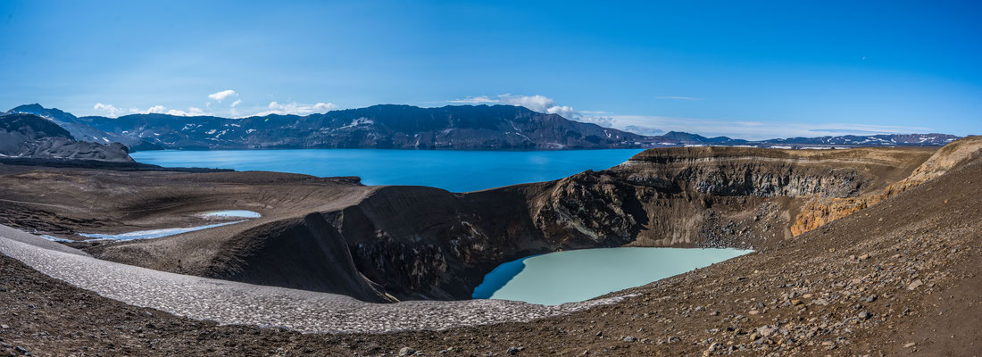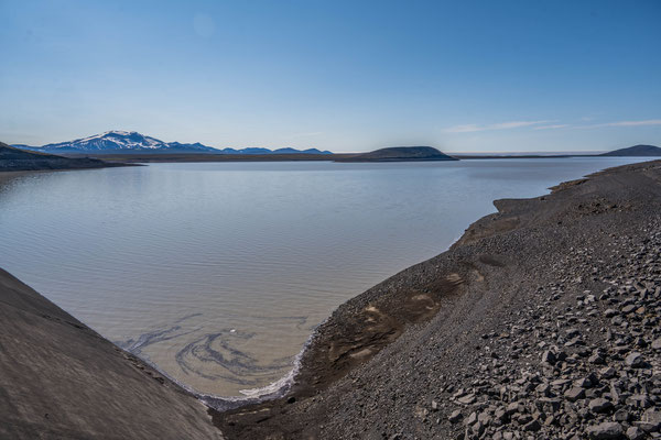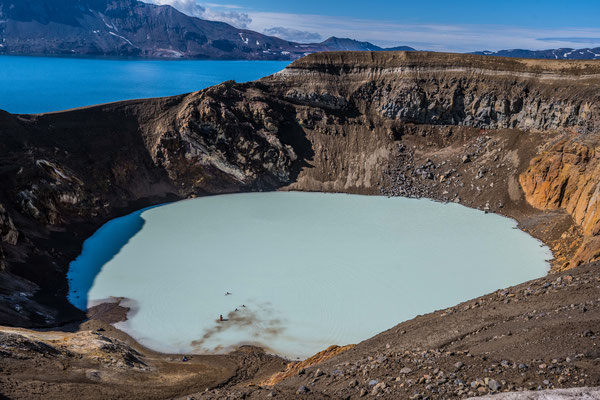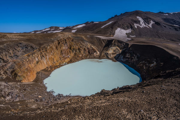 Ein kurzer Abstecher nach Norden führte uns beim ältesten geothermischen Kraftwerk Islands vorbei zum Kratersee Viti. Der knallblaue, fast kreisrunde See liegt in einem erloschenen Krater und bildet mit seiner Farbe einen verblüffenden Kontrast zu den grauschwarzen Lavaaschehügeln rundherum.