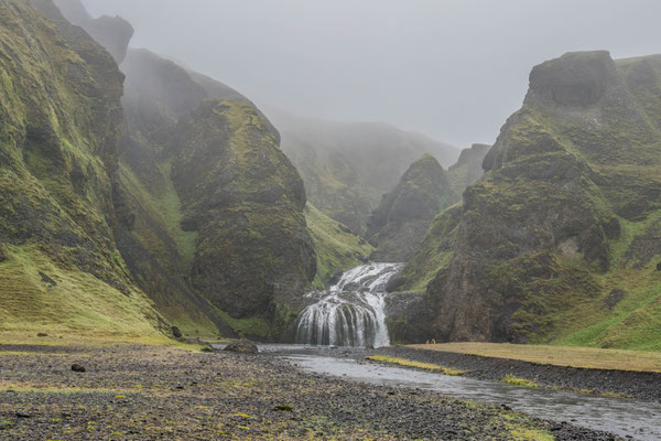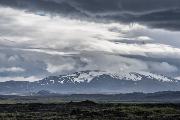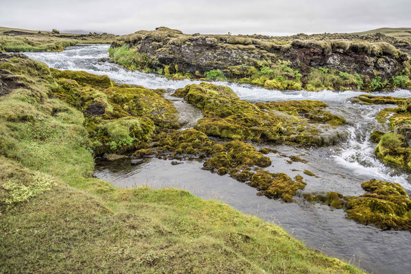 Wir fuhren zur Hauptstrasse zurück und legten einen weiteren Halt beim Krater Grabrok ein. Dieser Vulkan war vor etwa 3000 Jahren ausgebrochen und hinterliess einen gewaltigen Lavastrom. Die schwarze Lava ist mittlerweile von hellem Moos und Sträuchern bedeckt. Eine kurze Wanderung führt zum Kraterrand hinauf, von wo sich bei schönem Wetter eine gute Weitsicht bietet. Bei unserem Besuch verhüllte jedoch bereits wieder Nebel die Sicht auf die Umgebung.
