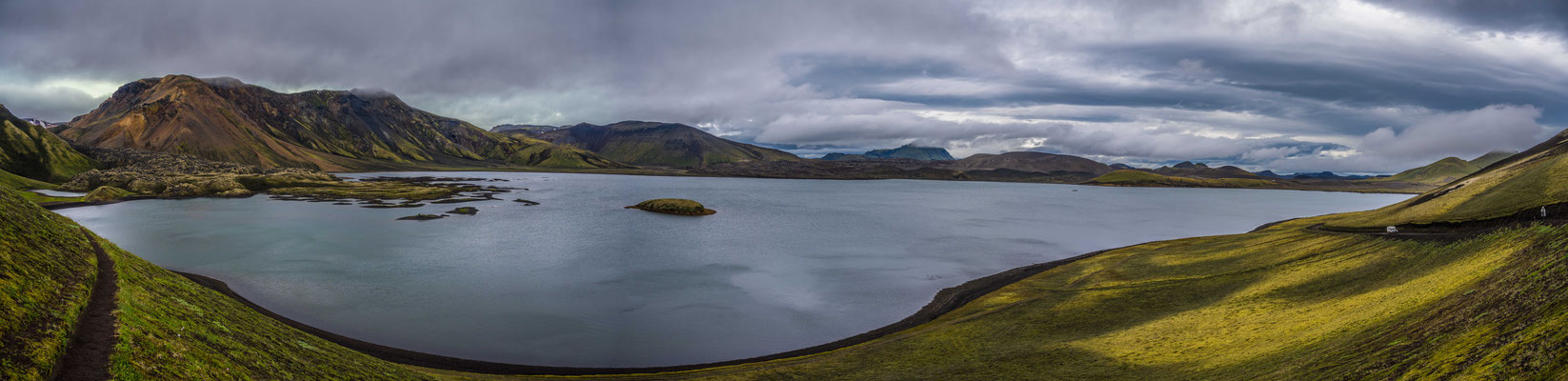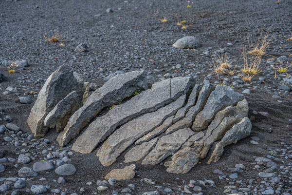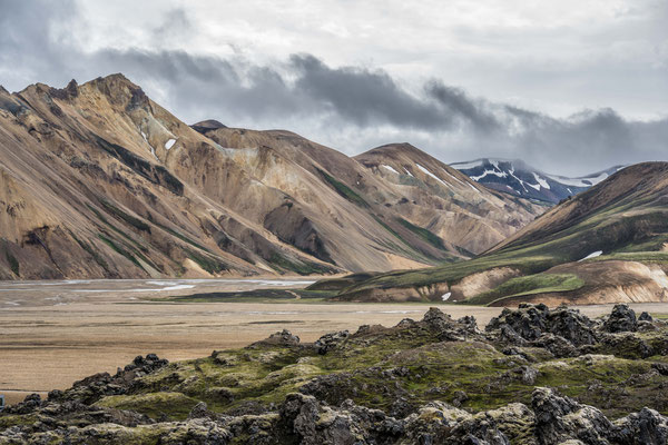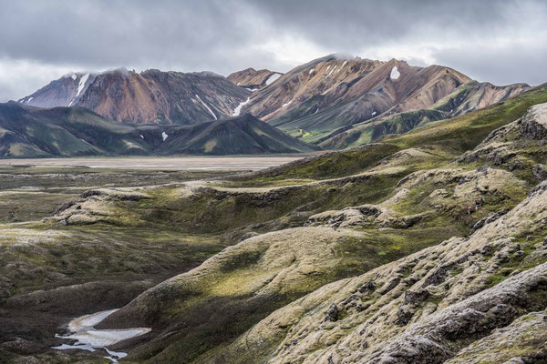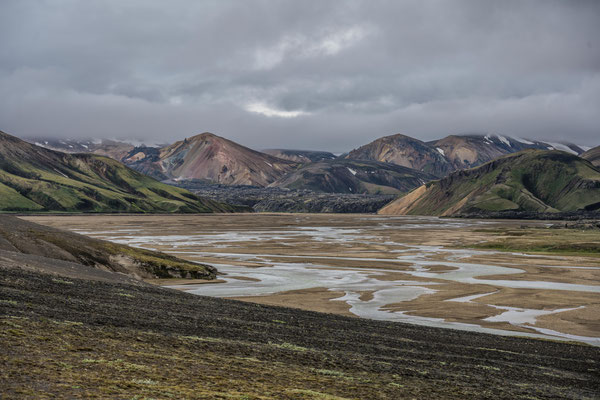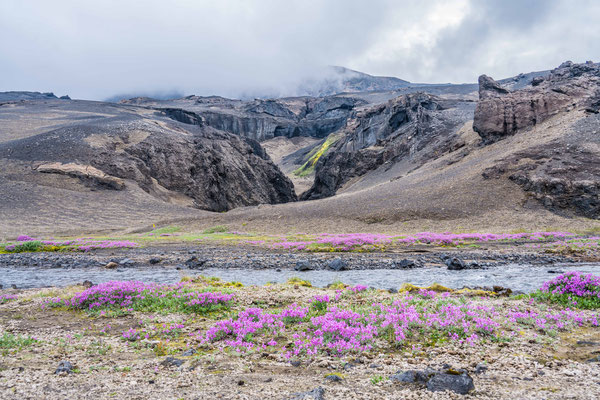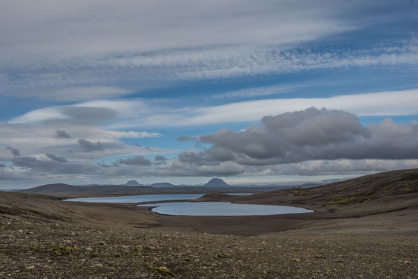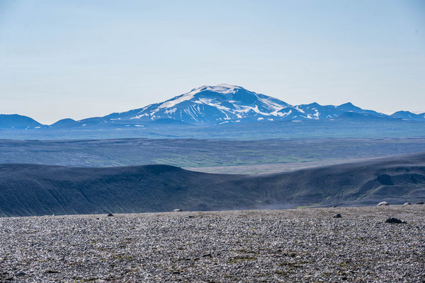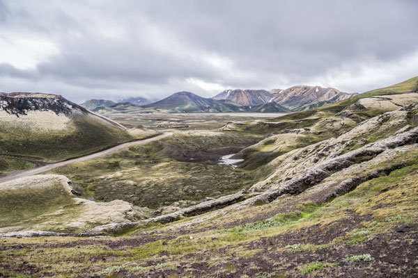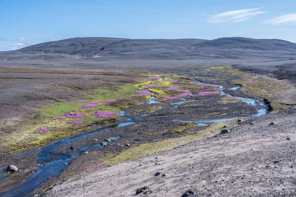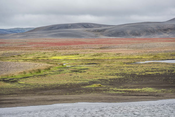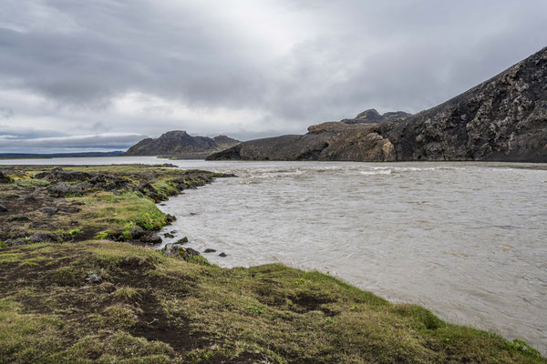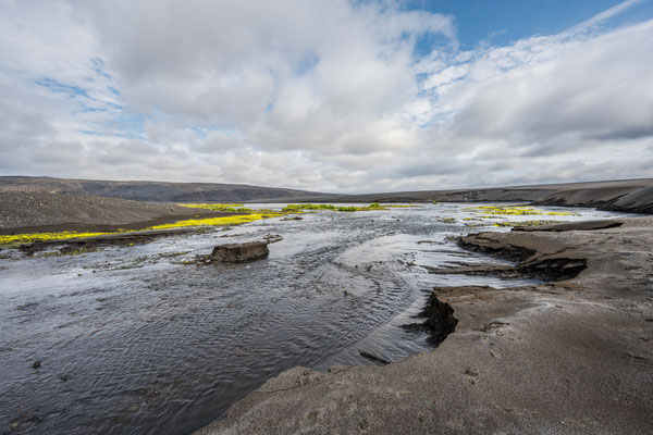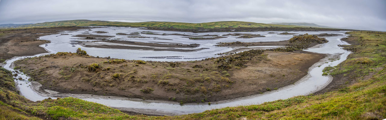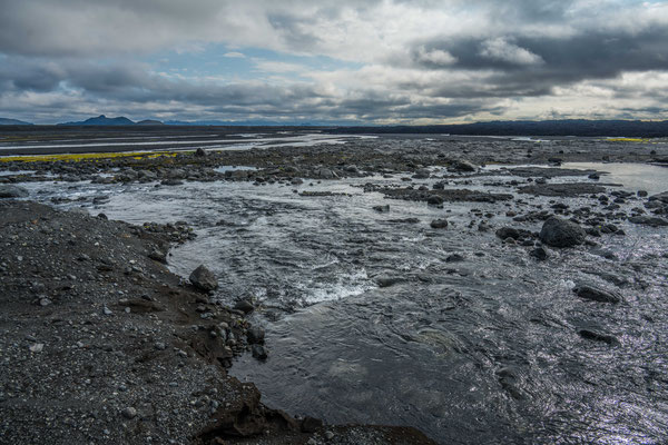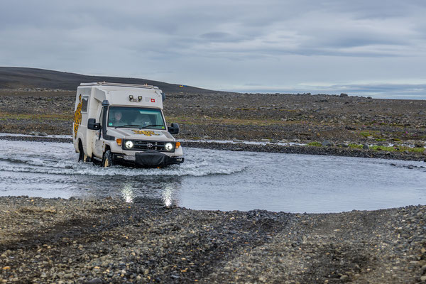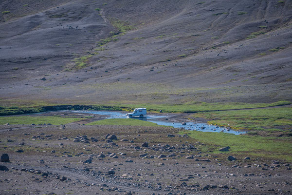 Wir fuhren weiter über die Piste Richtung Südwesten zur Landmannalaugar, ein bekanntes Geothermalgebiet, welches sowohl bei Geologen als auch bei Wanderern sehr beliebt ist. Auf dem Weg dorthin, hatte Ueli auf der Karte bei Stöng eine warme Quelle ausgemacht. Diese wollten wir suchen und allenfalls dort übernachten. Den entsprechenden Pistenzugang fanden wir zwar, aber die Quelle suchten wir vergeblich. Als wir schliesslich vor einer Furt standen, an welcher weder frische Spuren in den Fluss noch die weiterführende Piste ersichtlich waren, hatten wir nicht den Mut, diese zu durchfahren. Wir drehten deshalb um und erreichten die Hofruinen Stöng über die Hauptpiste. Das ehemalige Gehöft samt Nebengebäude wurde um 1100 bei einem Ausbruch des nahe gelegenen Vulkans Hekla vollständig verschüttet. Inzwischen konnte das Langhaus aus der Wikingerzeit ausgegraben, rekonstruiert und für Besucher zugänglich gemacht werden. Ein kurzer Spaziergang führt vom Parkplatz zur Ausgrabungsstelle, von wo sich ausserdem ein herrlicher Ausblick über das weite Tal bot.
