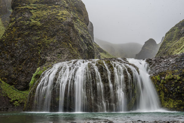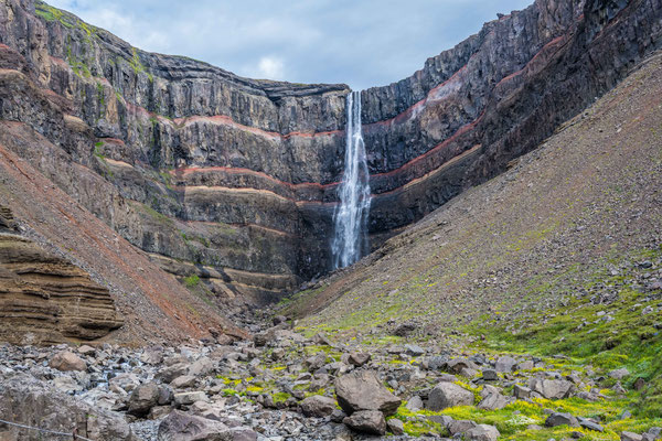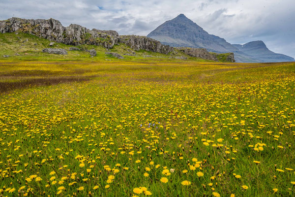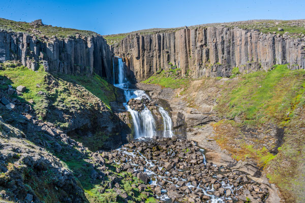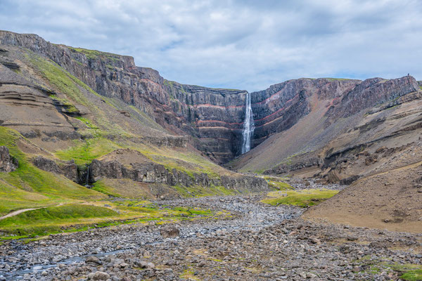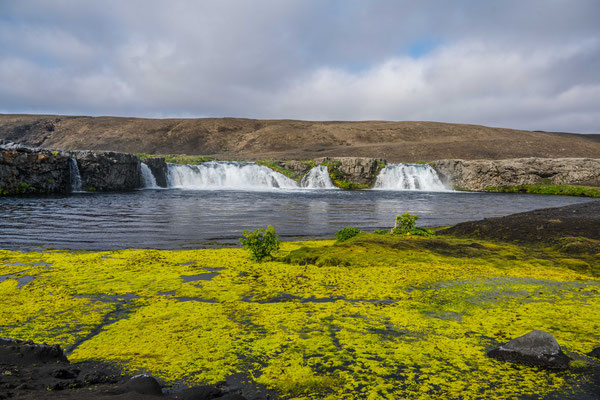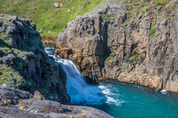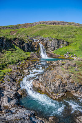 Am Dynjandifoss, einem der schönsten Wasserfälle Islands, legten wir einen Halt ein und stiegen an mehreren kleinen Kaskaden vorbei zum breit gefächerten Hauptwasserfall auf. Da die Umgebung des Dynjandi seit 1981 unter Naturschutz steht, konnte sich an dessen terrassenartigem Hang eine vielfältige, einmalige Flora ansiedeln, was dem ganzen zusätzlichen Reiz verleiht.
