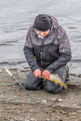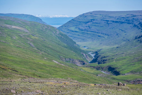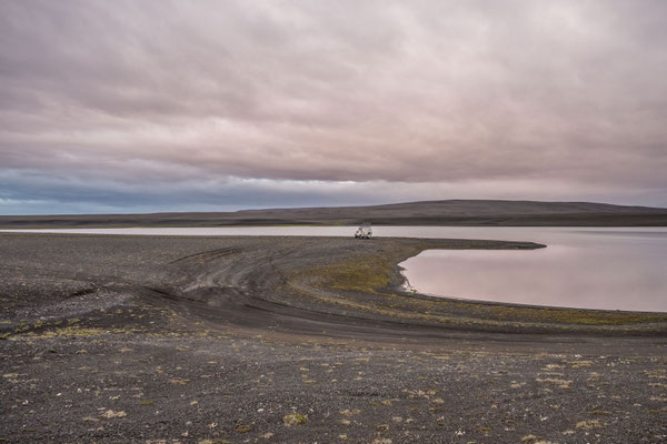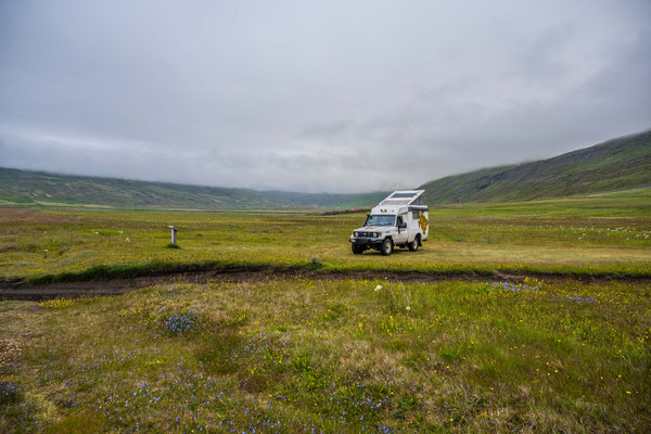 Um auf die Strasse Richtung Vopnafjördur zu gelangen, mussten wir erst ein gutes Stück zurückfahren und über einige kleine Pisten zur Ringroad gelangen. Danach ging es auf der gegenüberliegenden Flussseite wieder Richtung Meer. Direkt am Fluss fanden wir ein Buschcamp und genossen bei immer noch angenehmer Temperatur einen Apero zusammen. Schnell wurde es aber auch heute kühl und wir zogen uns ins warme Auto zurück.