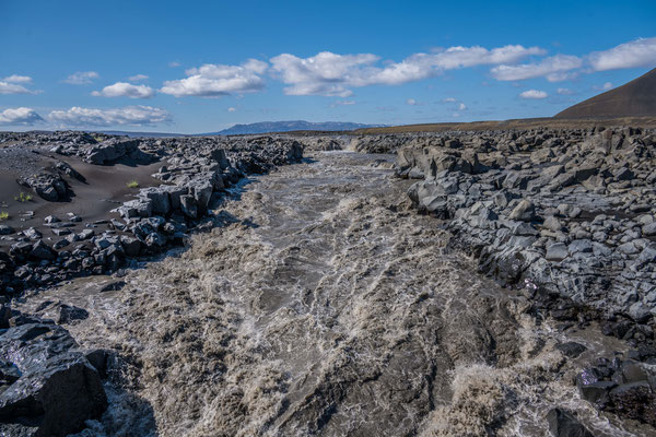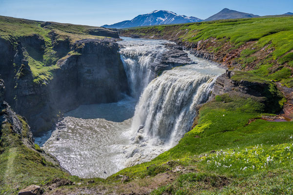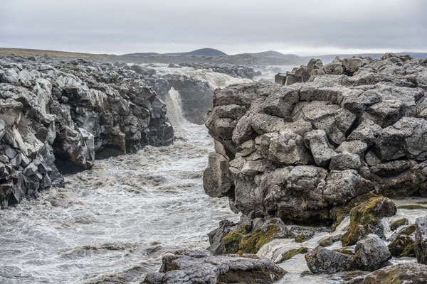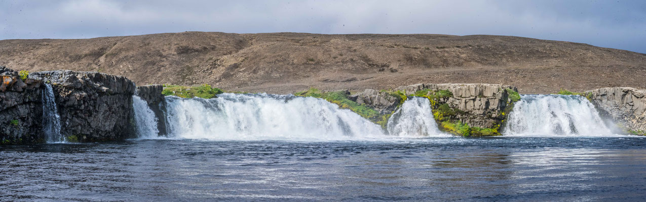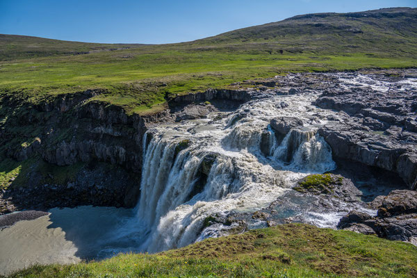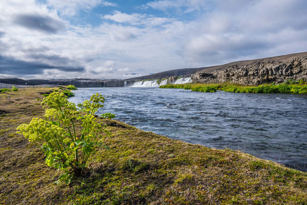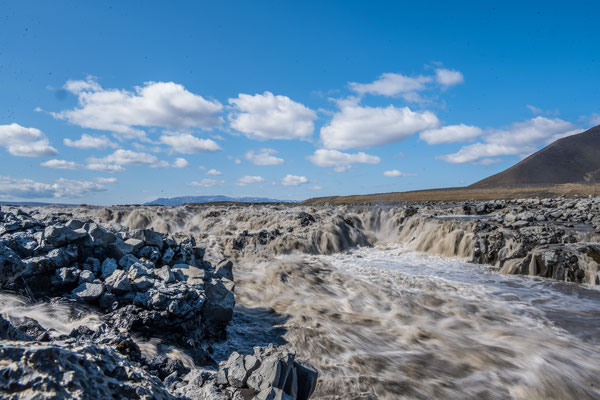 Auf der Weiterfahrt legten wir einen ersten Halt am Dettifoss ein, dem mächtigsten der vielen Wasserfälle auf Island und dem grössten von ganz Europa. Die tosenden, grauen Wassermassen stürzen in einen schmalen Schlund und die Gischt verpasst dem Besucher je nach Windrichtung eine heftige Dusche. Von verschiedenen Aussichtspunkten aus lässt sich das Spektakel beobachten. Zum fotografieren erwiesen sich die Morgenstunden jedoch nicht als ideal, denn man blickt immer in die Sonne. Nur wenige hundert Meter flussaufwärts liegt der Selfoss. Dieser ergiesst sich breit gefächert, in vielen Einzelfällen über die Felsstufen. Nicht ganz so eindrücklich wie der Dettifoss, aber durchaus sehenswert.