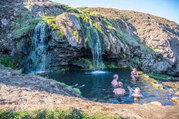 Auf demselben Weg, den wir gekommen waren, fuhren wir zurück zur Hauptstrasse, welche der Südküste entlang nach Osten führt. Wir hatten beschlossen, nur bis Flokalundur zu fahren. Dort erwartete uns ein netter Campingplatz und nicht weit davon entfernt eine weitere heisse Quelle, welche in einem natürlichen Pool direkt am Strand gefasst wird. Erst teilten wir das Bad noch mit ein paar anderen Gästen, nach kurzer Zeit hatten wir jedoch das Becken für uns allein und genossen die entspannende Wärme.