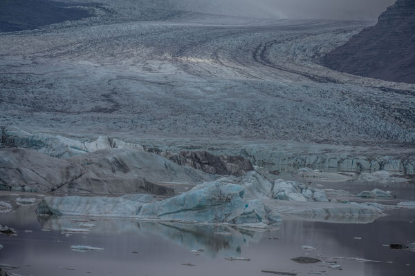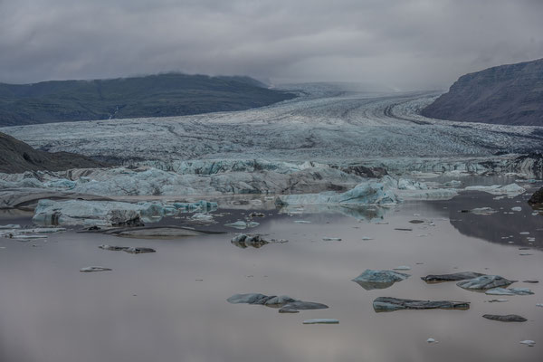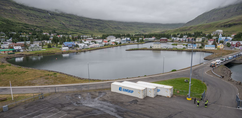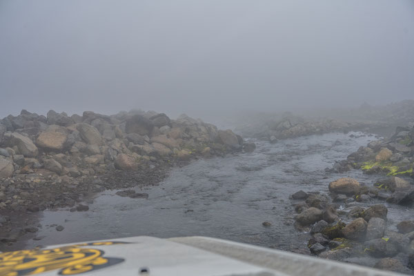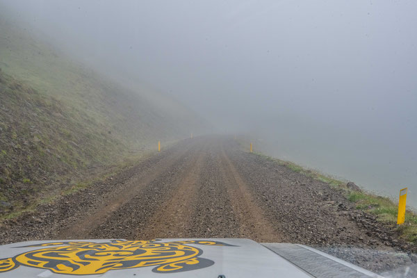 Wir hatten ja nur eine halbe Fahrstunde vom Hafen in Seydisfjördur übernachtet und waren deshalb ohne Stress zeitig vor Ort. Anders als bei der Ankunft hatte es auf dem Pass nun keinen Schnee mehr und der See war eisfrei. Allerdings sahen wir davon nicht allzu viel, denn es herrschte wieder einmal dichter Nebel.