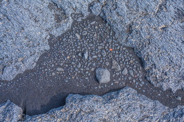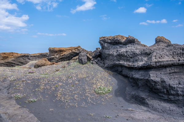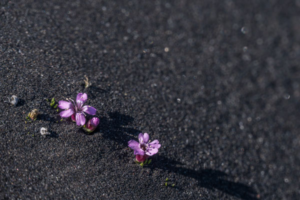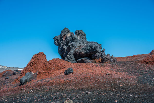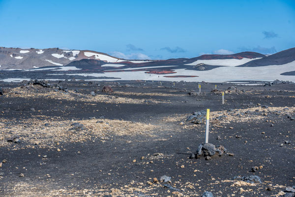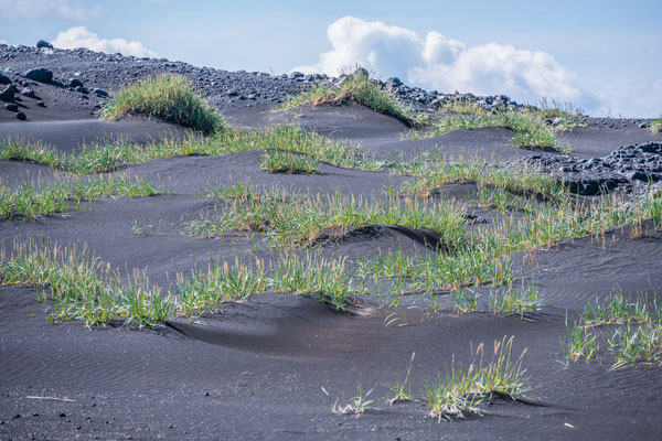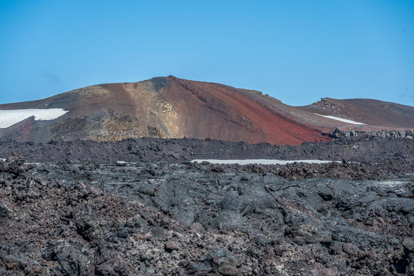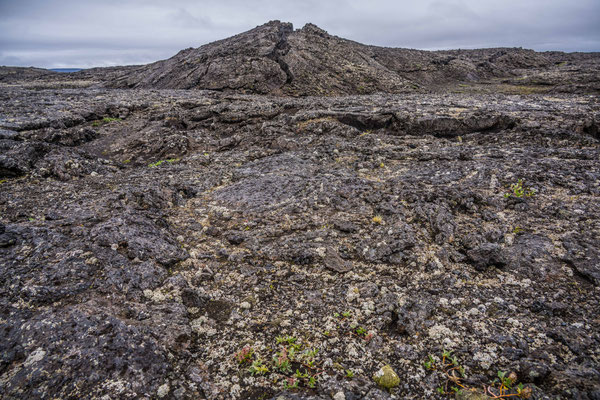 Nicht weit entfernt liegt ein relativ neues Lavagebiet, welches auf einer 5 km langen Rundwanderung erkundet werden kann. Von einem Aussichtspunkt aus erhielten wir einen Eindruck über die riesige Ausdehnung dieses Lavaflusses. Nach wie vor tritt überall Dampf aus Spalten und Löchern und an einigen Stellen haben sich Schwefelablagerungen angesammelt. Schroffe Lavabrocken wechseln sich ab mit Elefantenhaut ähnlichen Oberflächen. Auf den kahlen, 1984 entstandenen Lavafeldern wachsen Flechten und es zeigen sich zaghaft erste Kleinpflanzen und Blumen.