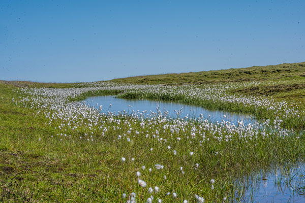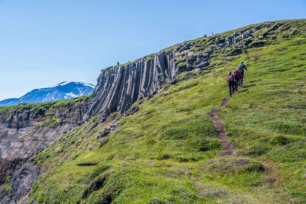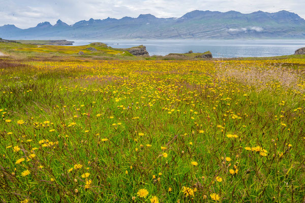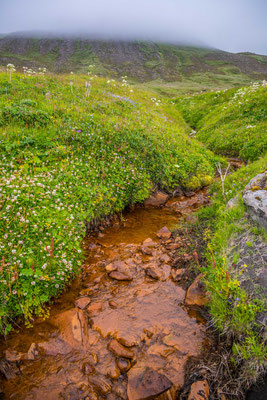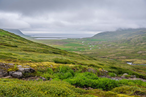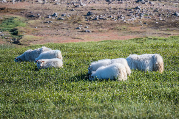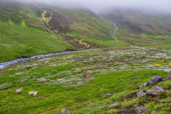 Am nächsten Morgen fuhren wir zusammen zum Hafen hinaus und liessen ein Fahrzeug beim Ziel der heute geplanten Wanderung stehen. Bevor jedoch los marschierten, besuchten wir die Papageientaucher. Die putzigen Vögel mit ihren bunten Schnäbeln lassen sich durch die Besucher offensichtlich nicht stören, halten sie sich doch ohne Scheu in unmittelbarer Nähe der extra angelegten Holzstege auf. Es herrschte ein ständiges Kommen und Gehen in der Kolonie, in welcher bis zu 5000 Paare in ihren Erdhöhlen brüten. Auch andere Seevögel, vor allem Möwen, finden Platz für ihre Nester auf dem grasbewachsenen Felskopf. Die drolligen Tiere boten Fotomotive im Überfluss, einzig das Fotografieren der landenden Vögel war sehr schwierig, denn die eher kleinen Vögel sind sehr schnell. Wir verliessen den Vogelfelsen und stellten das zweite Auto auf dem anderen Wanderparkplatz ab. Wir stiegen erst steil zu einem Pass hoch. Die Vegetation war erstaunlich abwechslungsreich und bot eine reiche Blumenpracht entlang des Weges. Der Aufstieg brachte uns ganz schön ins Schwitzen, denn nach dem dichten Nebel vom Vorabend zeigte sich das Wetter wieder sonnig und warm. Nach erreichen der Passhöhe erblickten wir unser erstes Ziel, die Bucht Brunavik. Der Abstieg war steil und rutschig, aber wir erreichten den Strand schliesslich ohne Schwierigkeiten. Wir gönnten uns eine ausgedehnte Mittagspause, bevor wir einem Bach aufwärts folgend bis zu einer 4x4 Piste hochstiegen. Ausser ein paar wenigen Schafen, die das grüne Tal durchwanderten, waren wir allein auf weiter Flur. Die Piste führte zu einem weiteren Pass hoch, von welchem aus wir den Abstieg zurück zum Auto in Angriff nahmen.