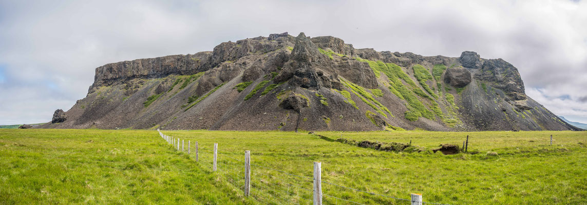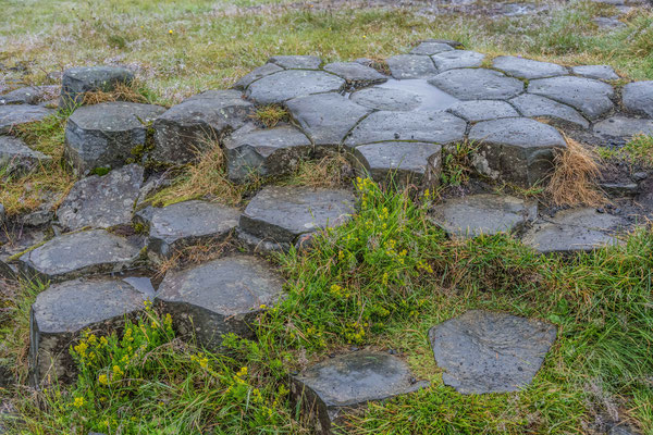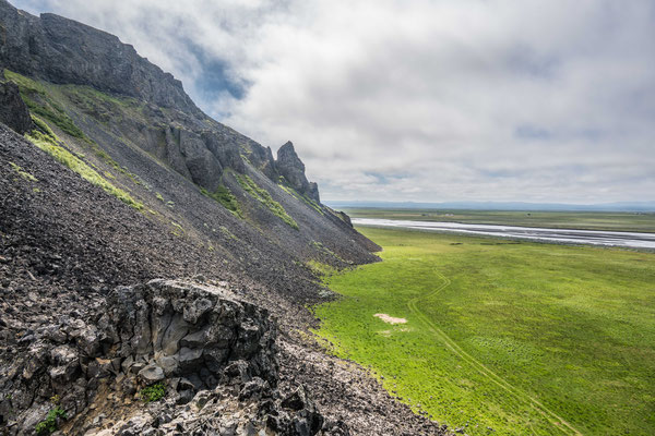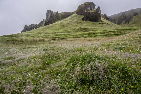 Kurz darauf bot ich die Gelegenheit, die Füsse zu vertreten. Ein kurzer Weg über eine Wiese führte zu einem felsigen Hügel. Über einen steilen, rutschigen Pfad erklommen wir den Felsen, auf welchem das Grab eines mystischen Norwegers liegen sollte. Nach einer der unzähligen Sagen und Geschichten in Island soll dieser Mann nach einem Verbrechen von Norwegen geflüchtet sein und sich hier versteckt haben. Vom Grab waren einzig ein paar angeordnete Steinbalken zusehen, die Aussicht auf die Umgebung war den Aufstieg trotzdem wert gewesen.
