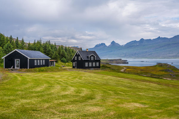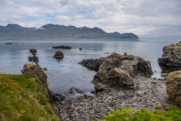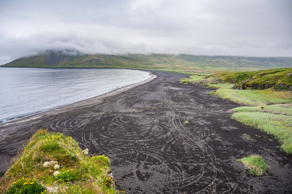 Bei der Weiterfahrt entlang den östlichen Fjorden meinte es das Wetter wieder einmal nicht sonderlich gut mit uns. Von der Landschaft bekamen wir nur wenig mit, denn die Wolken hingen tief und zum Teil fuhren wir durch dichten Bodennebel. Wir hatten geplant, noch einmal ein einsames und ruhiges Camp in der Natur zu suchen. Obwohl das Wetter dafür nicht optimal war, fuhren wir auf einer 4x4 Strecke zu einer Halbinsel hinaus und dort zu einer Bucht. Wie anhand der Karte zu erwarten, hatten wir den Ort für uns alleine. Das Camp lag direkt hinter den schwarzen Dünen des Strandes. Trotz wenig Sicht machten wir uns auf einen kurzen Strandspaziergang und genossen immerhin die frische Luft. Am folgenden Morgen hob sich der Nebel endlich, sodass wir auf der Rückfahrt doch noch in den Genuss der einmaligen Landschaft kamen.