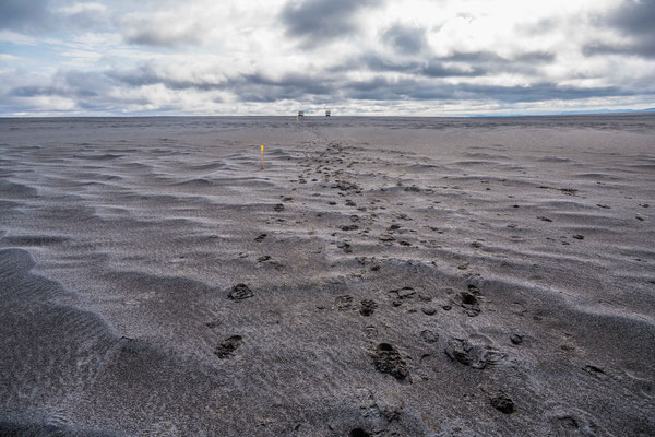 Am nächsten Morgen kauften wir uns das Zutrittsticket für die Schranke und fuhren die 4 km hinaus zur Hamburger Hallig. Der ehemalige Bauernhof, welcher heute als Restaurant geführt wird, liegt auf einem künstlich aufgeschütteten Hügel und ist somit weitgehend vor steigenden Fluten sicher. Nur bei Jahrhundertsturmfluten mussten die ursprünglichen Bewohner und ihr Vieh hinter den Deich evakuiert werden. Die ganzen Ebenen in Nordfriesland sind Teil eines Nationalparks und werden von unzähligen Gras- und Wasservögeln bevölkert.